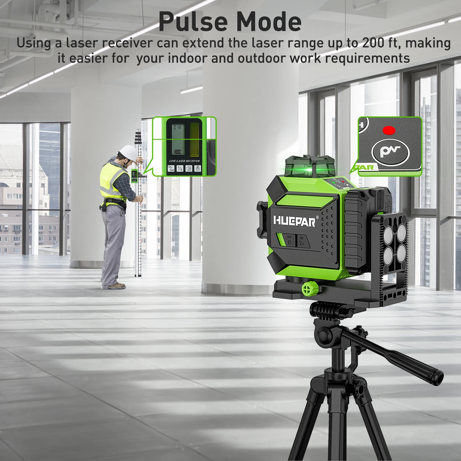 • Pulse mode extends the working range up to 60m/197ft in brighter working conditions when using Huepar Line Laser Detector (ASIN: B07L6FP48S).