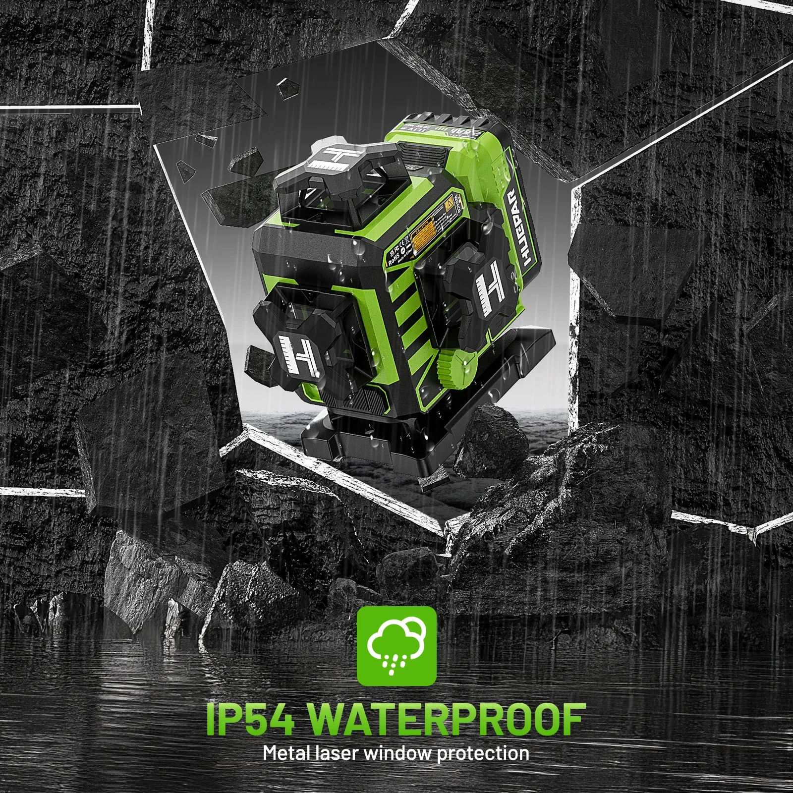 Over-molded metal laser window with IP54 water/dust proof withstands tough job site conditions. Ideal for construction projects, home improvement.