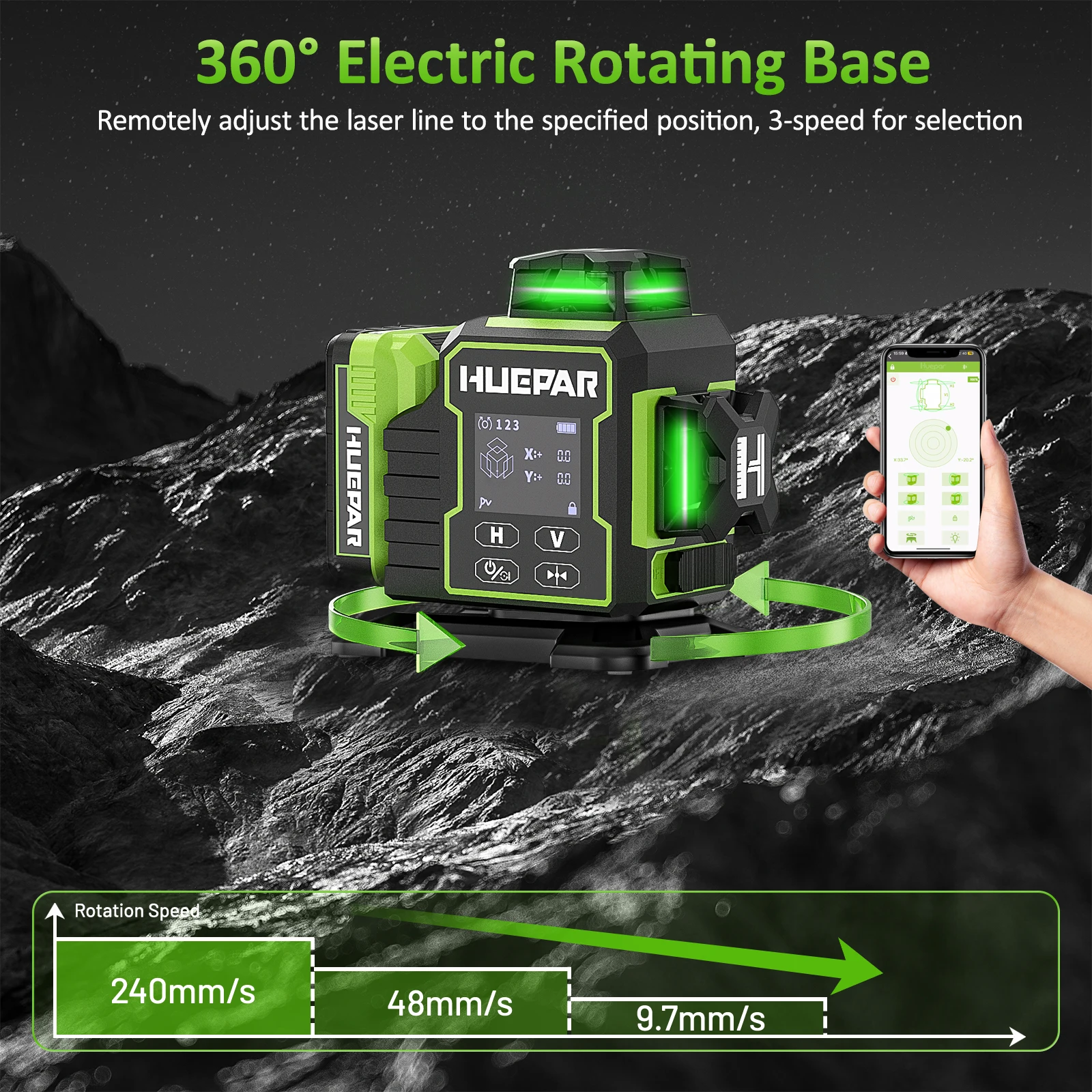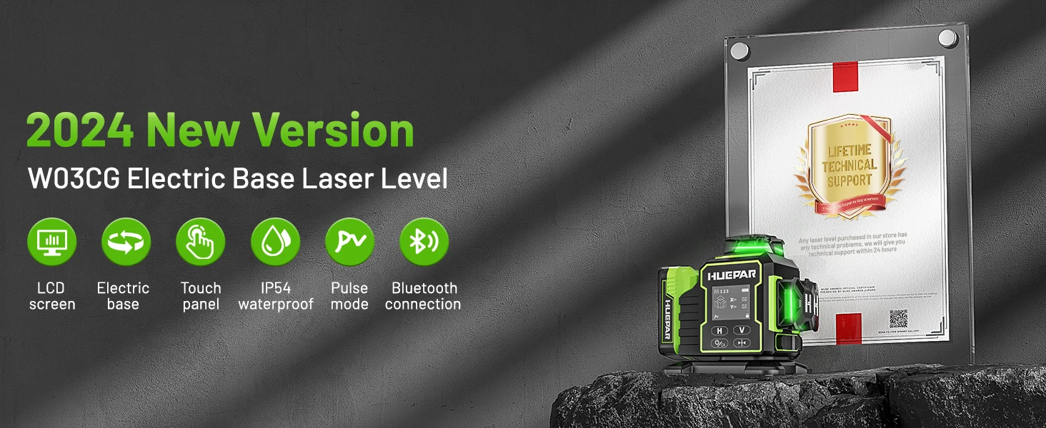 Huepar W03CG Laser Level Green Cross 3D 12 Lines Bluetooth Lazer Leveler With Electric Rotating Base & Large Battery LCD Screen & Remote