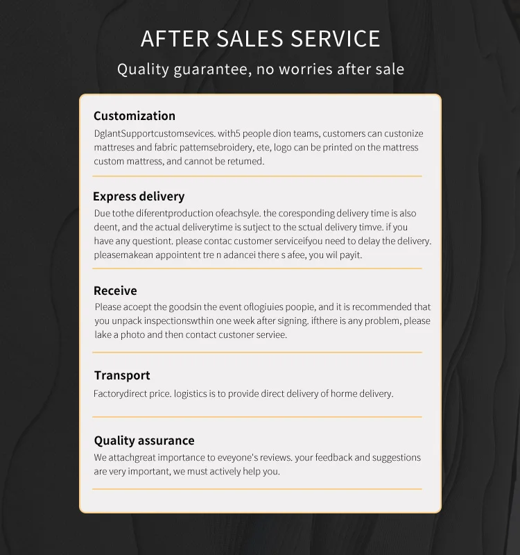 A: Quality is priority. We have our own professional QC team to be highly responsible for every single mattress from the very beginning to the very end.