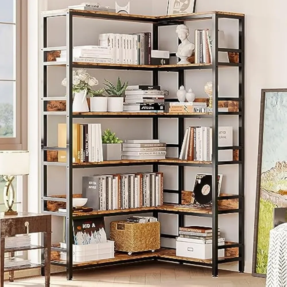Industrial Bookshelves 6 Tiers Corner Bookcases with Baffles Etagere Shelf Storage Rack with Metal Frame, Bookcases