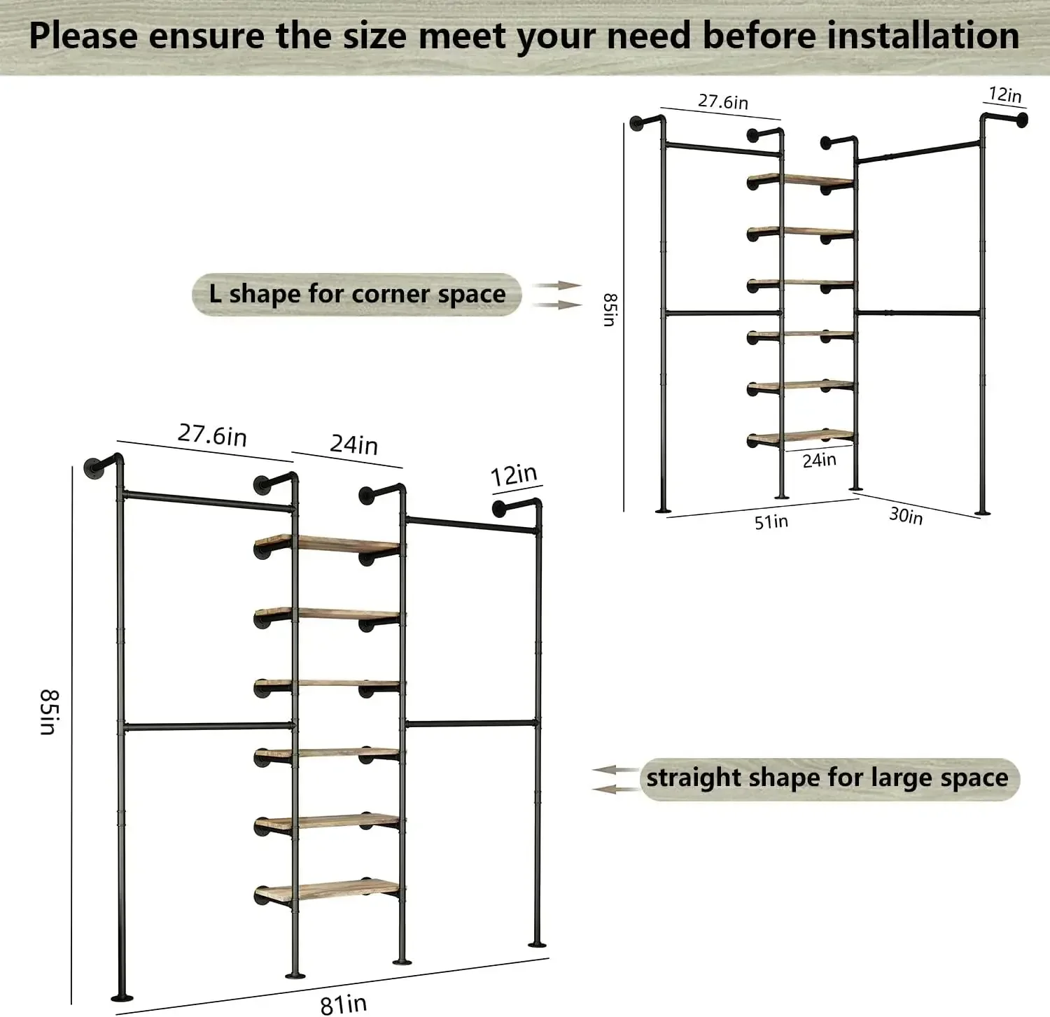 Industrial Pipe Clothes Rack, DÉCOR Wall Mounted Clothing Rack, for Walk-in Wardrobe Multi-Purpose Storage Clothes Hanging Shelf, 2 Installation Methods
