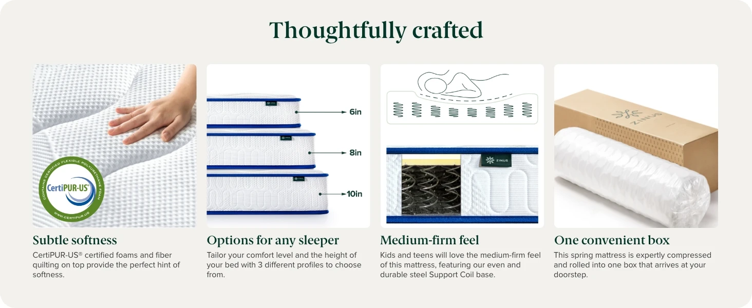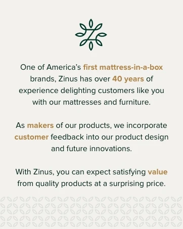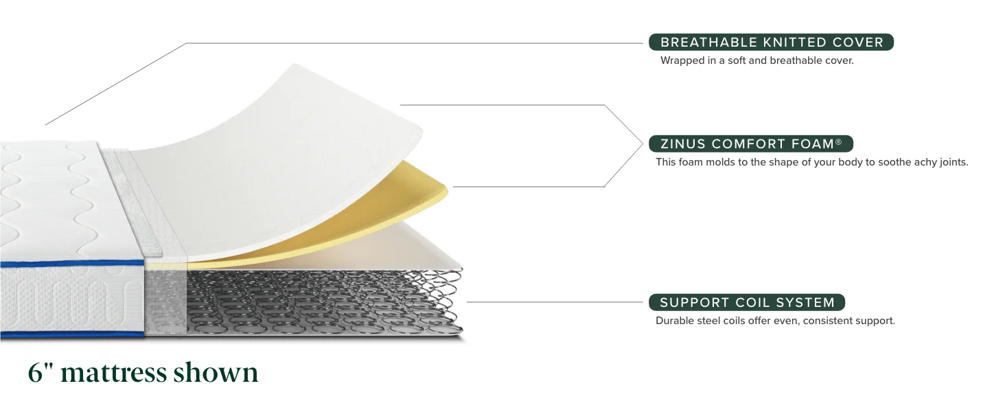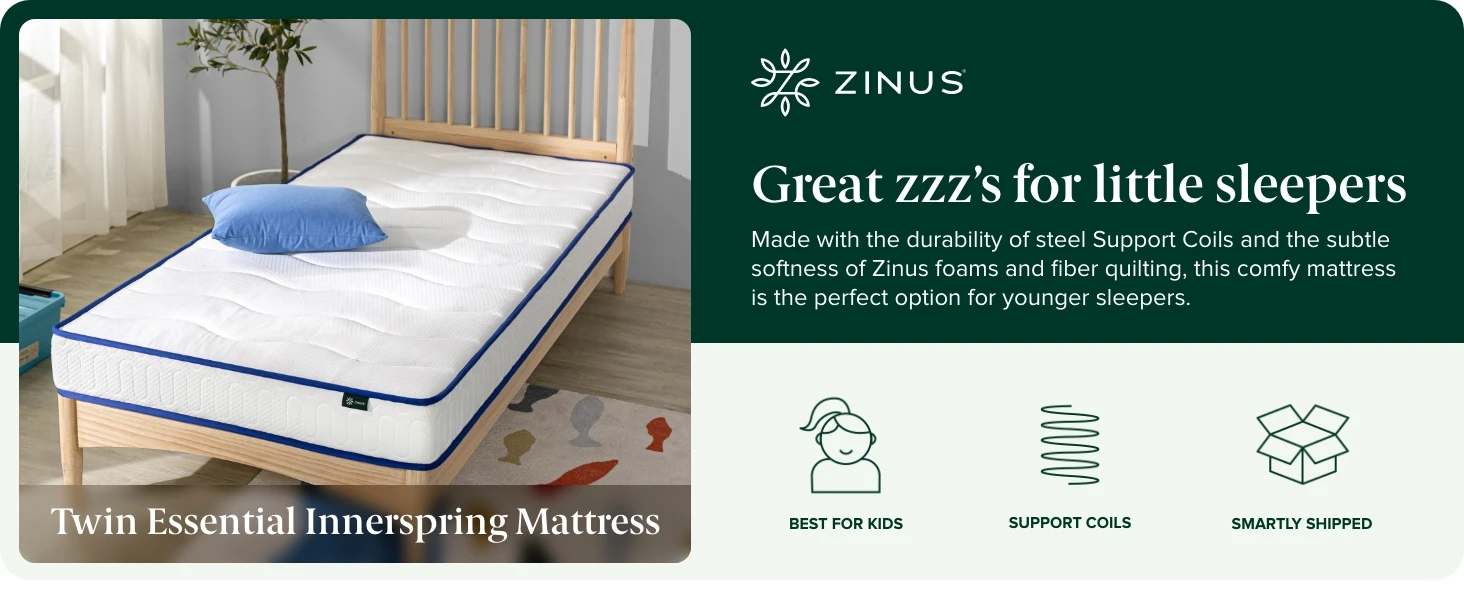 Everyone in the family deserves a great night’s sleep on a mattress that’ll support their every sweet dream. That’s why we created the Essential Innerspring Mattress, an affordable, well-made option for any bedroom needing a dose of dependable comfort. With its quilting and layers of Zinus Comfort Foam®, this traditional spring mattress offers a hint of softness and the durability of steel Support Coils. Beloved by all kinds of sleepers, its medium-firmness is great for many types of sleepers. Its soft and breathable knitted cover is designed to feel and look like a dream, with striking navy blue piping and an exquisite modern look that’ll make it seem like you spent way more than you actually did. The Essential Innerspring Mattress is compatible with a box spring, platform bed, or other mattress foundation, and is available in 3 different profiles so you can ensure the height of your bed is just right-no more struggling to get in or out! For ultimate convenience, we pack and ship this mattress in a box so it arrives at your door ready to be unrolled and enjoyed within 72 hours. Crafted for total comfort and a solid night’s sleep, this classic spring mattress will have you sleeping comfortably for many nights to come.