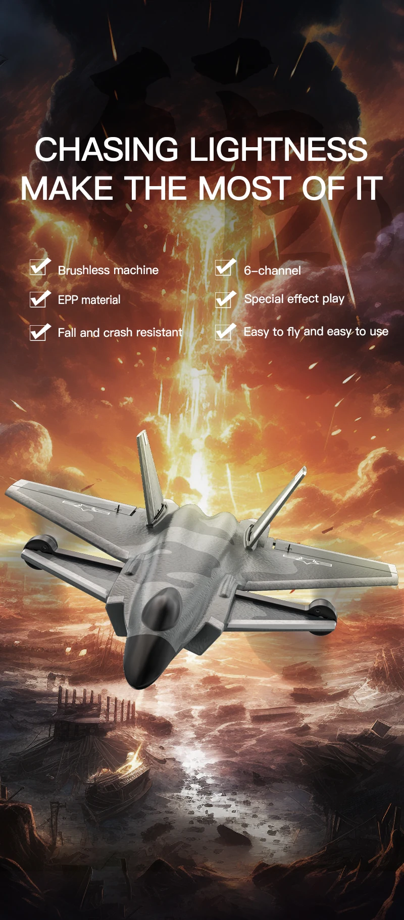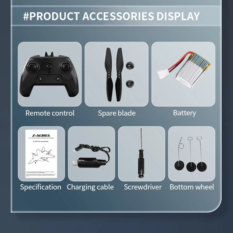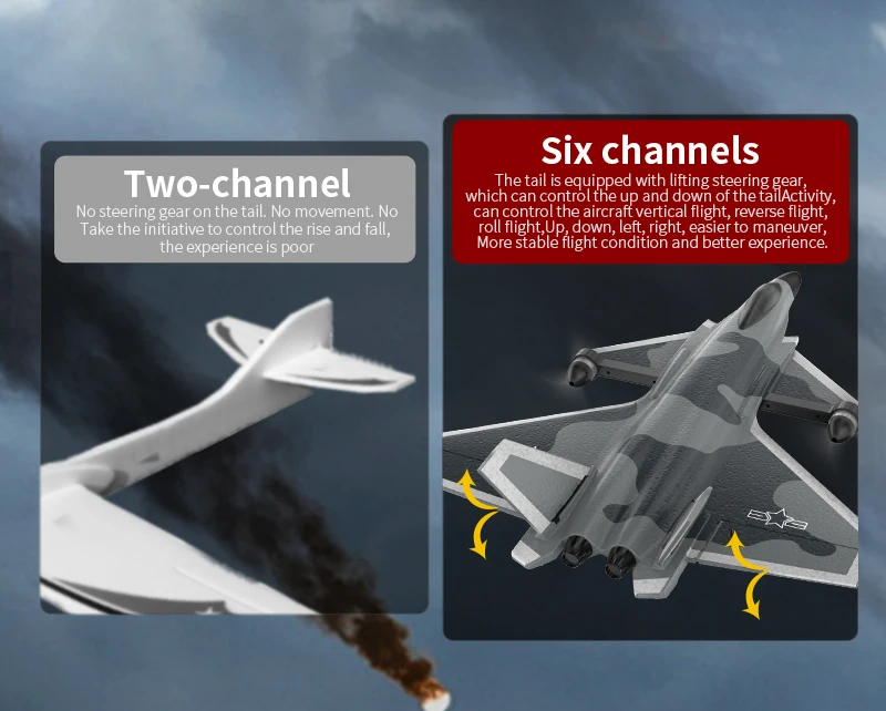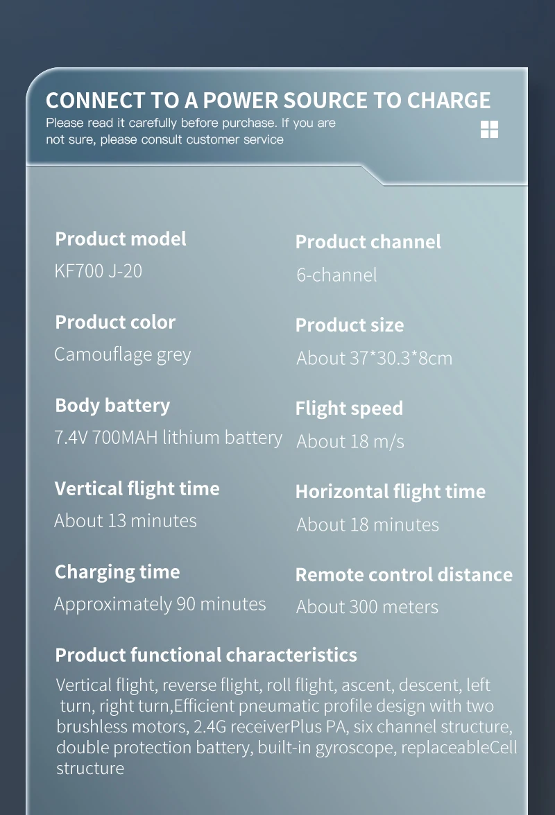 [Product function] : vertical flight, reverse flight, tumbling flight, rise, fall, left, right turn, using efficient pneumatic profile design, using two brushless motors, 2.4G receiver plus PA, six-channel structure, double protection battery, built-in gyroscope.