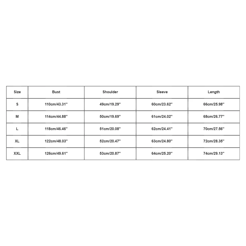 | Size:XXL | Bust:126cm/49.61” | Shoulder:53cm/20.87” | Sleeve:64cm/25.20” | Length:74cm/29.13” |