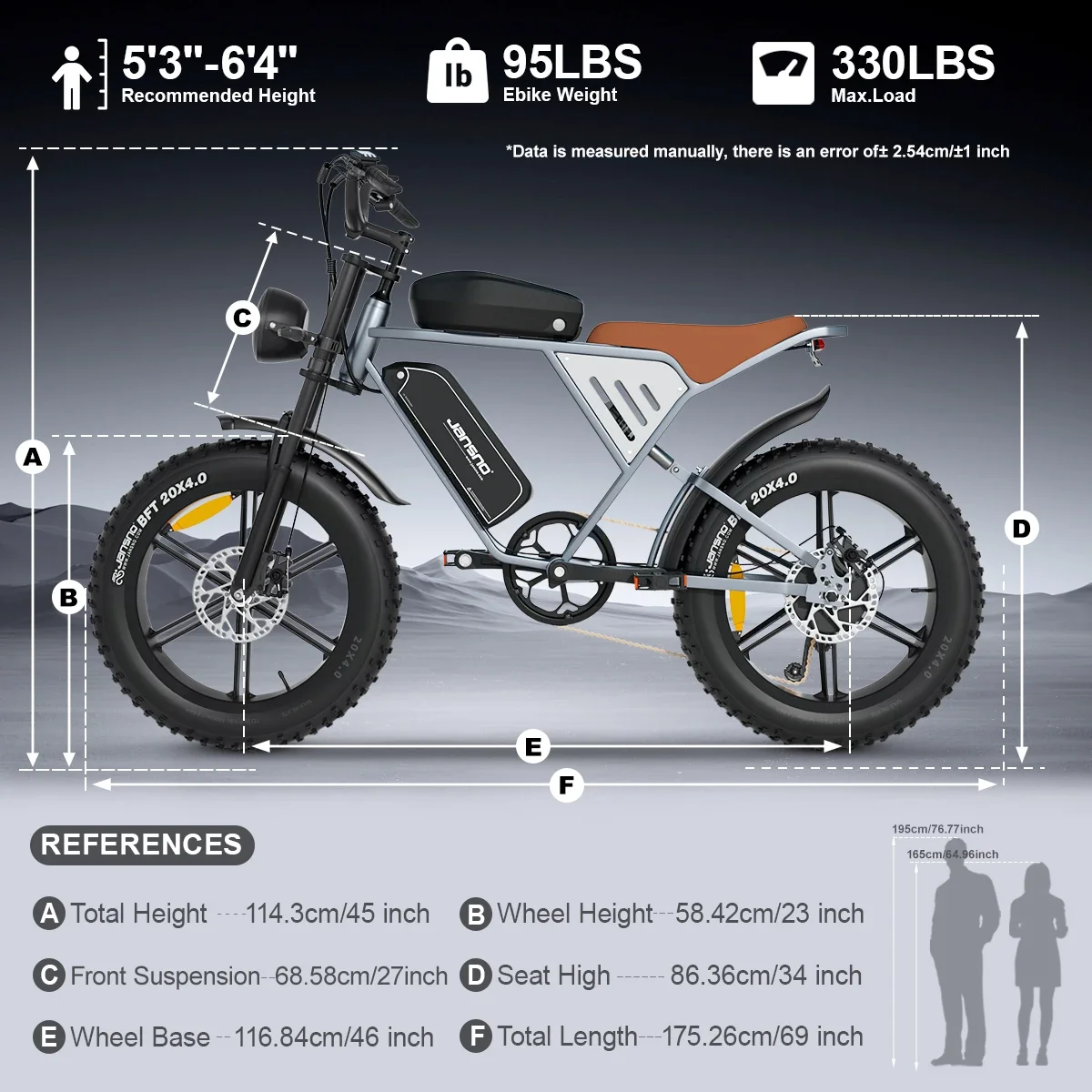 【HIGH PRECISION ENGINEERING DESIGN】- This electric bicycle frame is made of high-carbon steel, easy to climb 30 degrees – Tire: 20″ * 4.0 snow tyrep; Enhanced anti-skidding and wear-resistant tires, adapt to snow, sand and other complex topography. Adapt to all terrain, snow road, sand road, gravel road. Front and rear mechanical disc brakes bring you peace of mind.