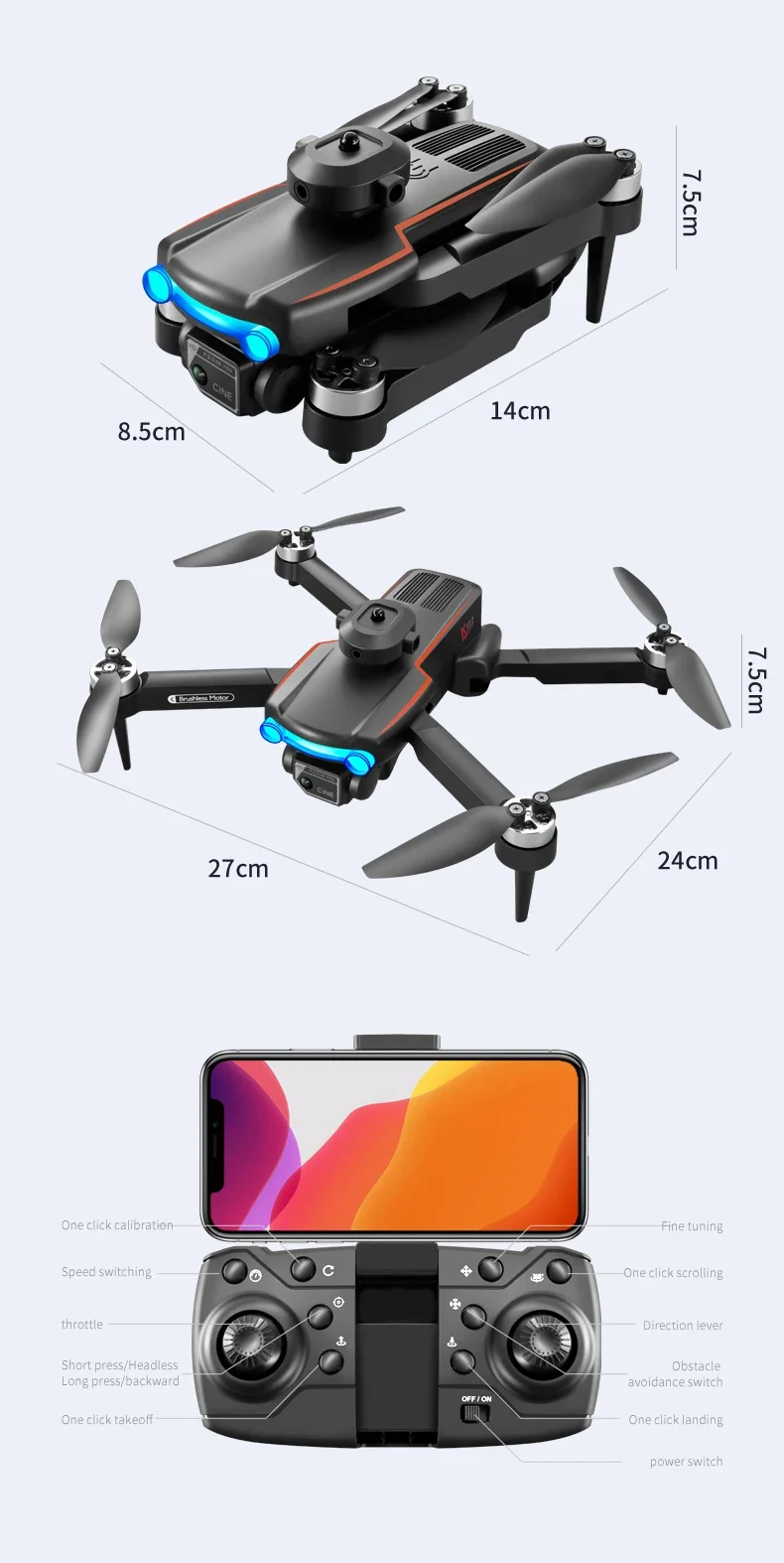 One button to take off/ One button to land/ Ascent/ Descent/ Left/ Right steering/ 360° roll/ Headless mode/ Fast and slow gears/ Taking pictures/ Recording/ Switching dual cameras/ Face Recognition Auto Photo/ Gravity Sensor/ Trajectory Flight/
