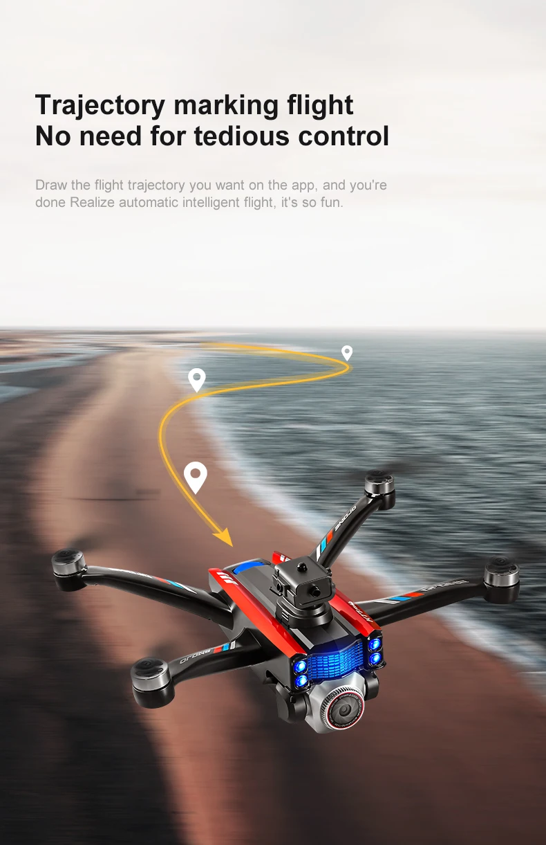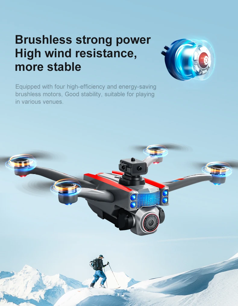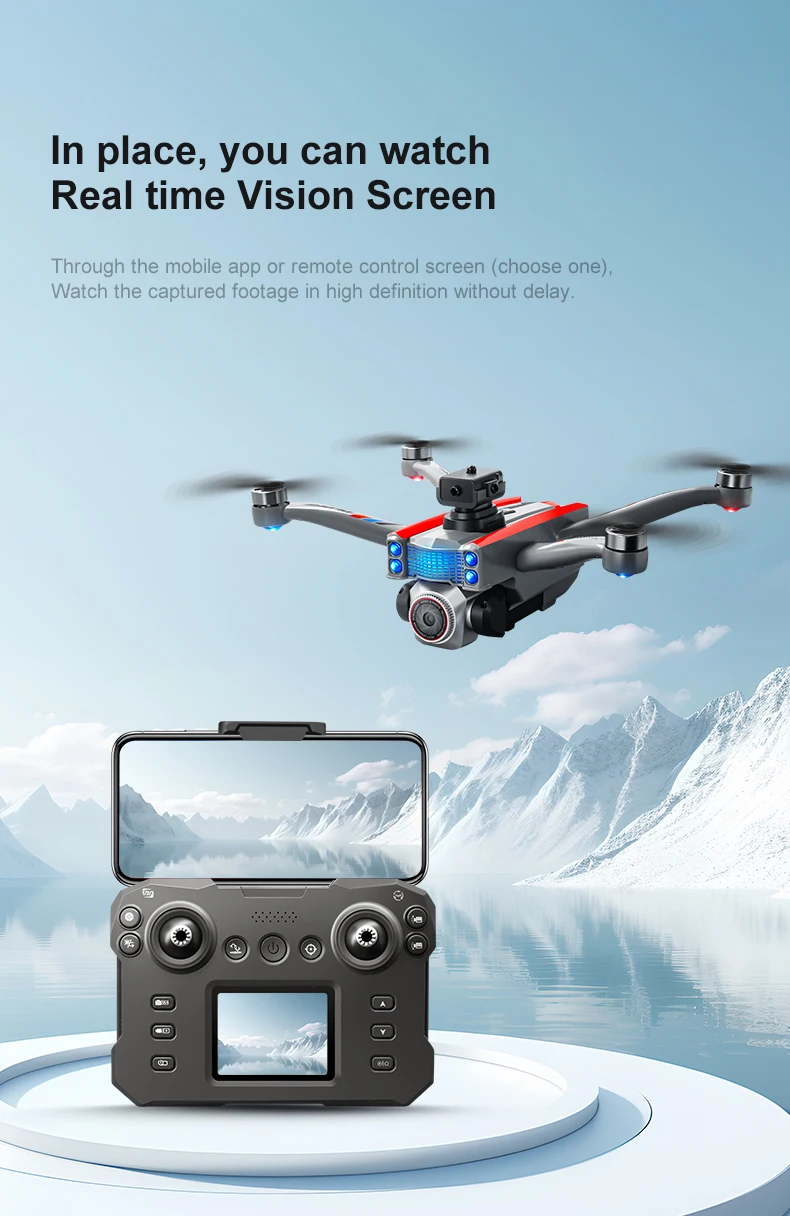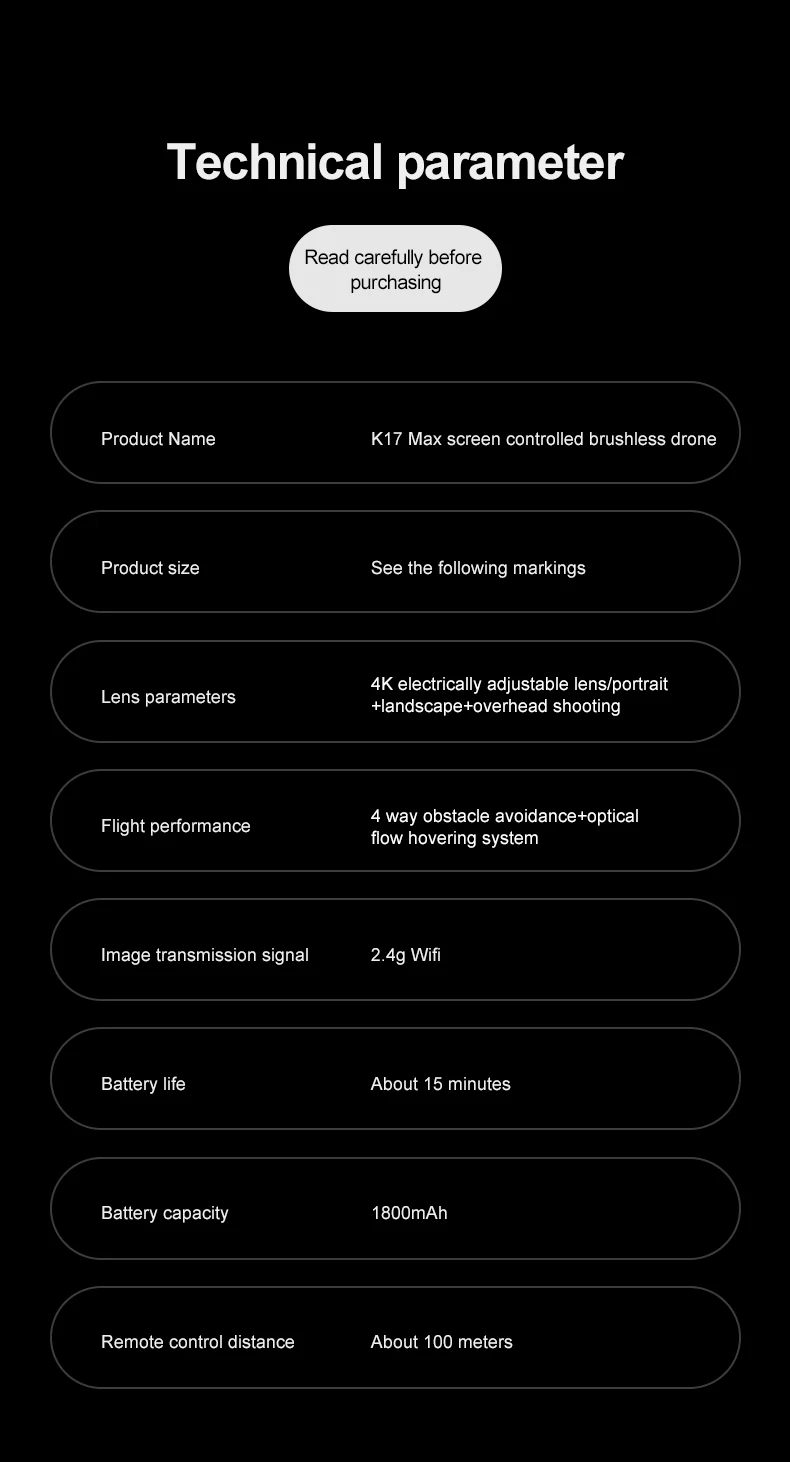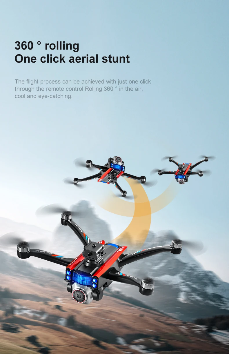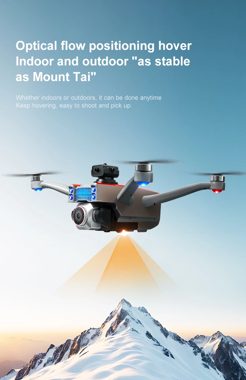 Product function: "Real time image transmission screen remote control/brushless motor/electric lens/horizontal/vertical/downward shooting/optical flow positioning/four-way obstacle avoidance storage type remote control air pressure fixed high definition image transmission/gravity sensing trajectory finger drawing 2.4G signal special effects rolling/speed switching mobile phone control one landing takeoff one key landing"