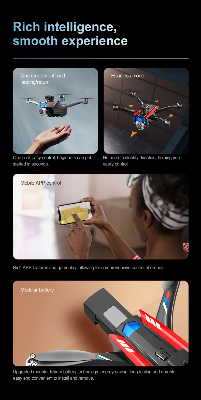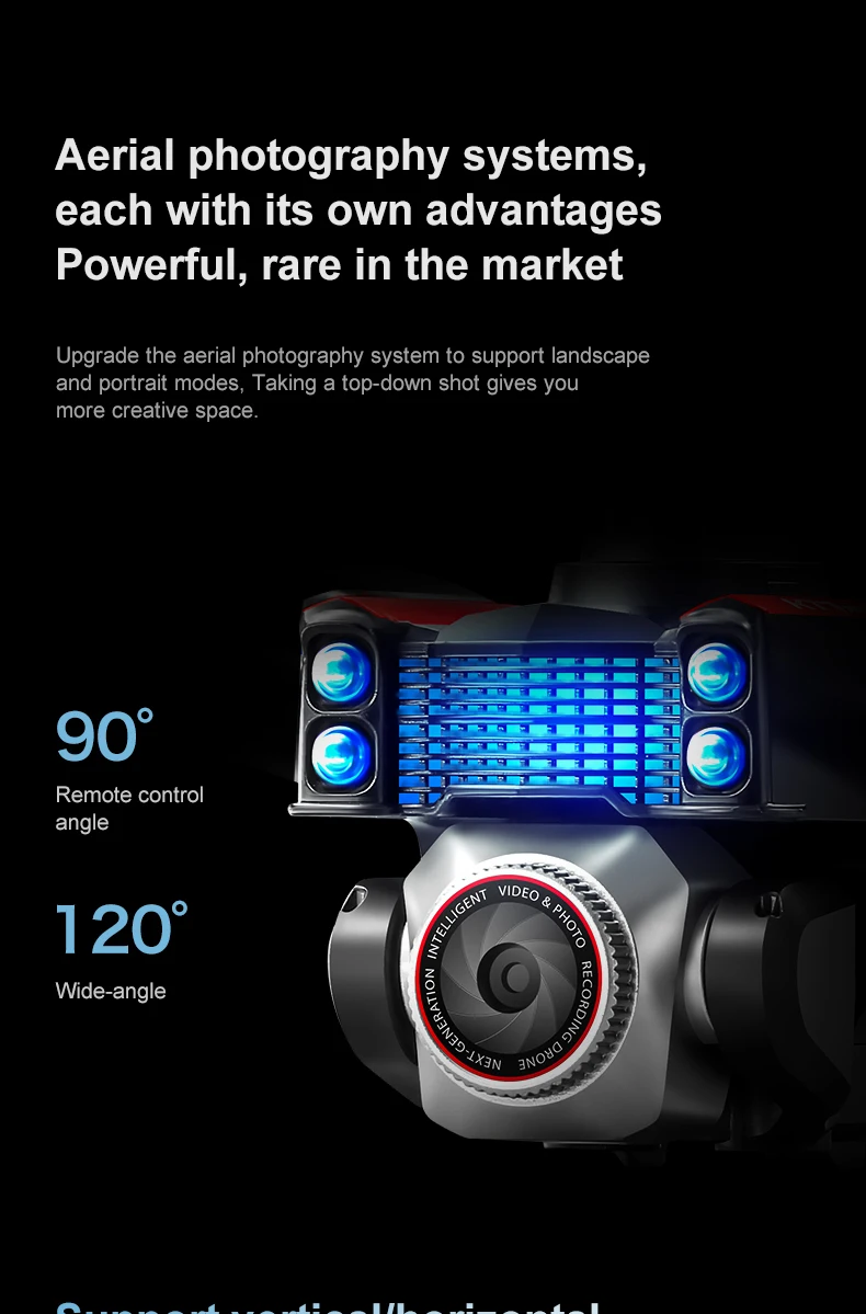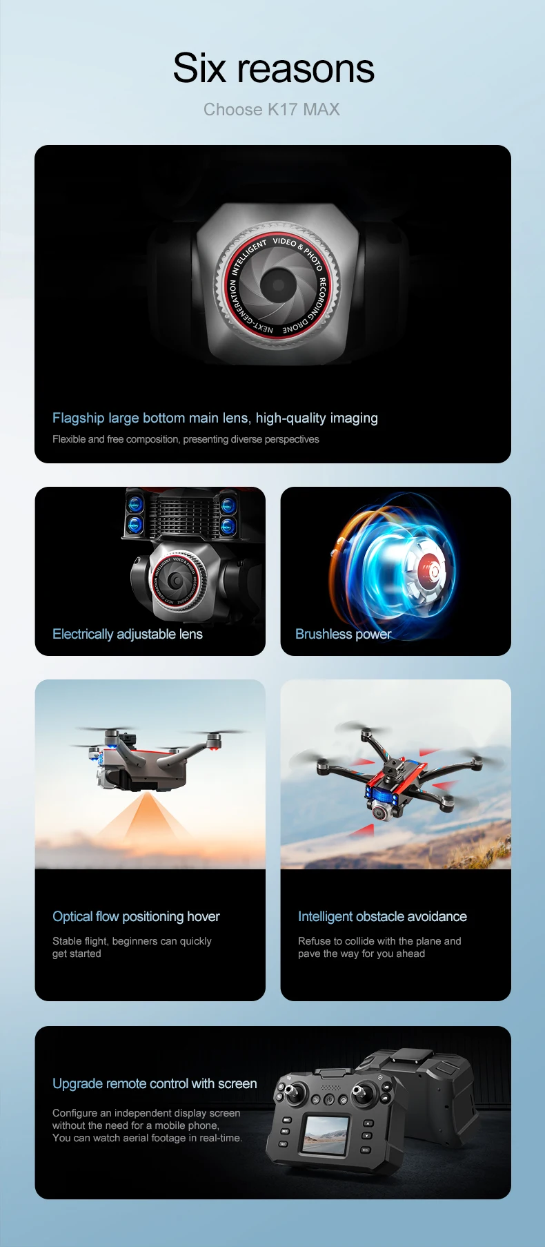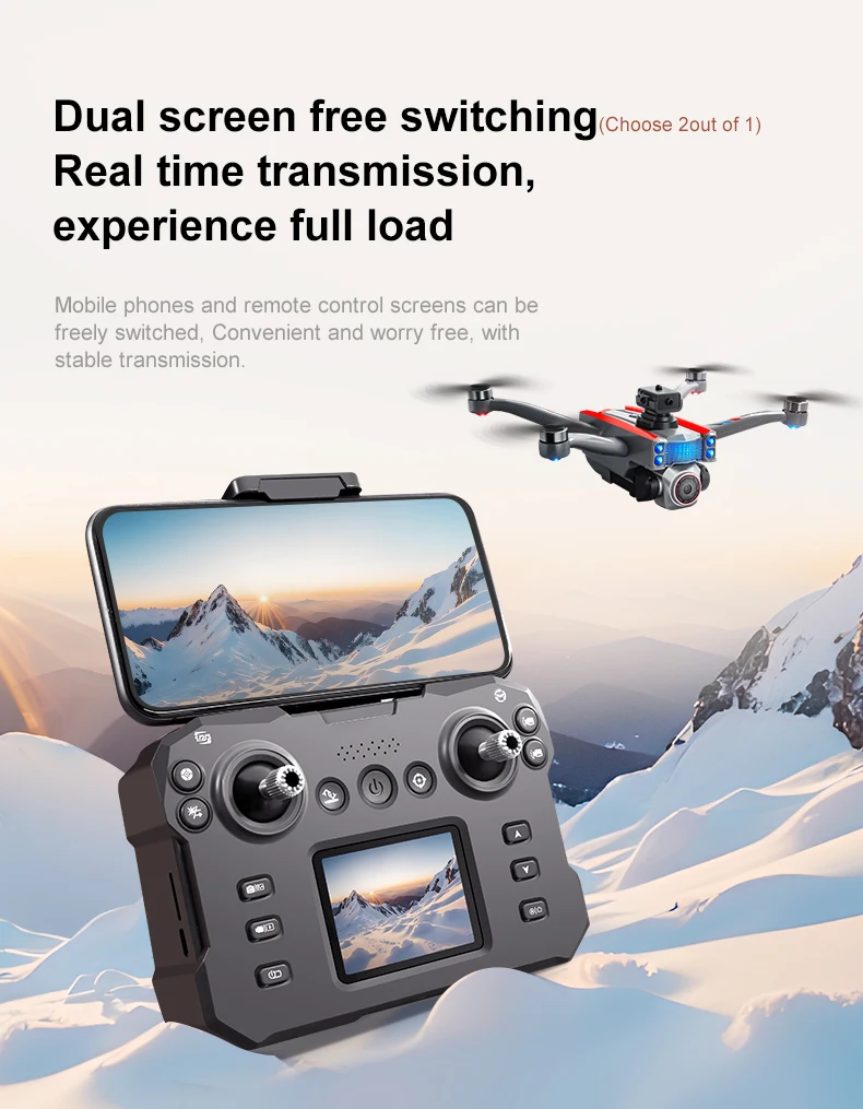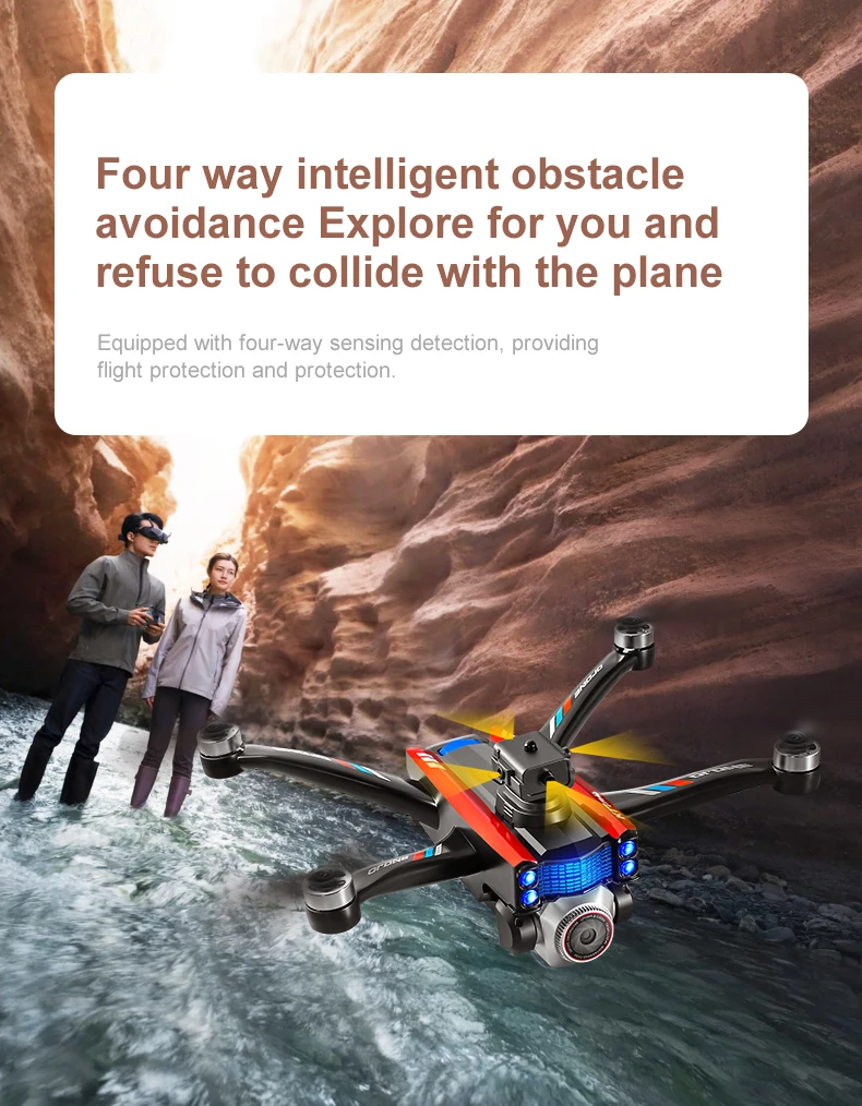 Product function: "Real time image transmission screen remote control/brushless motor/electric lens/horizontal/vertical/downward shooting/optical flow positioning/four-way obstacle avoidance storage type remote control air pressure fixed high definition image transmission/gravity sensing trajectory finger drawing 2.4G signal special effects rolling/speed switching mobile phone control one landing takeoff one key landing"