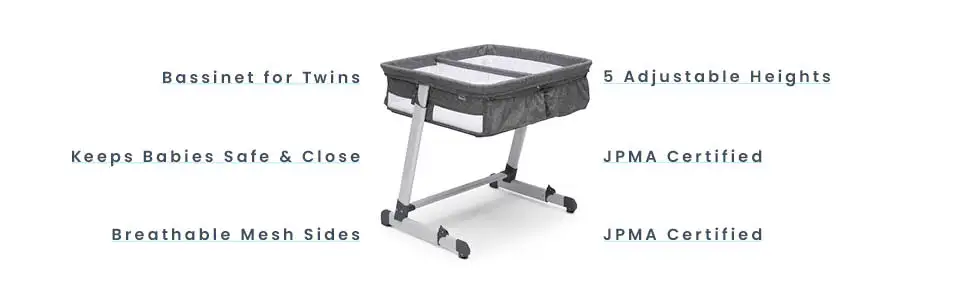 Keep your newborn twins close with the Simmons kids by the bed Twin city sleeper bassinet. The bassinet’s modern z-shaped frame is outfitted with wheels, so you can easily slide the base under your bed giving your babies a safe, separate sleep space That’s still close to you (and each other.). perfect for all mothers (especially those who are breast feeding or recovering from C-sections), this bassinet’s sturdy, adjustable base with five height levels fits next to almost any bed, and keeps your baby at eye level, so you can easily soothe and tend to them during their first few months. Mesh sides provide a clear view and help with airflow. For your ease, storage pockets provide space for burp clothes, small toys or pacifiers. The Twin bedside sleeper of your dreams, The Simmons kids by the bed Twin city sleeper bassinet allows you to feel close and connected to your little ones in the safest way possible. This bassinet is recommended for babies 0-5 months. Stop use at 5 months or once your infant begins to push up on their hands and knees, whichever comes first.