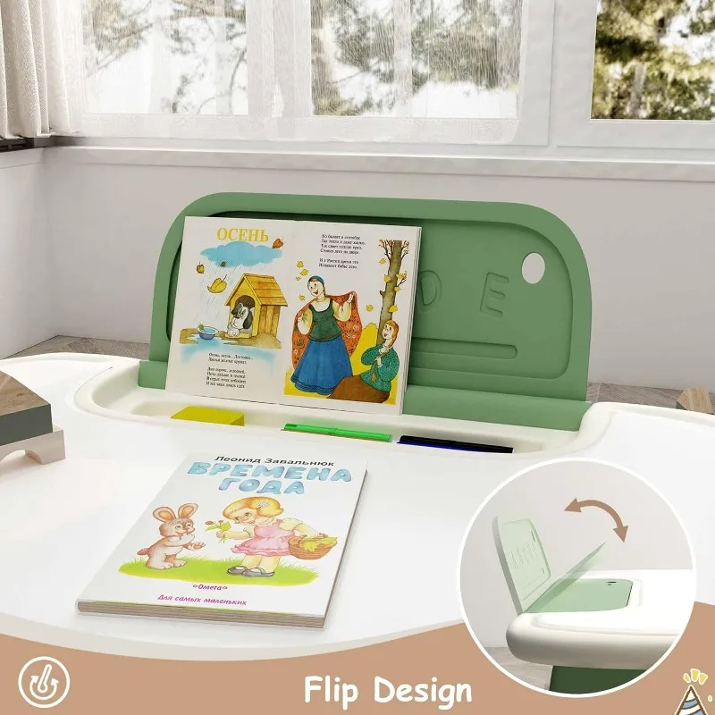 - Table doubles as activity table or dining table with storage shelf for books and supplies