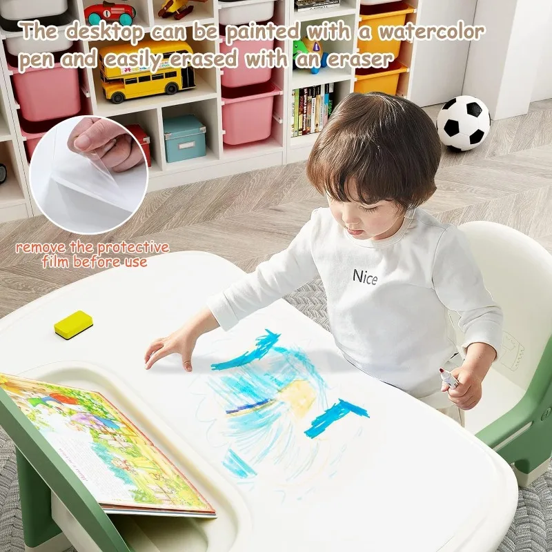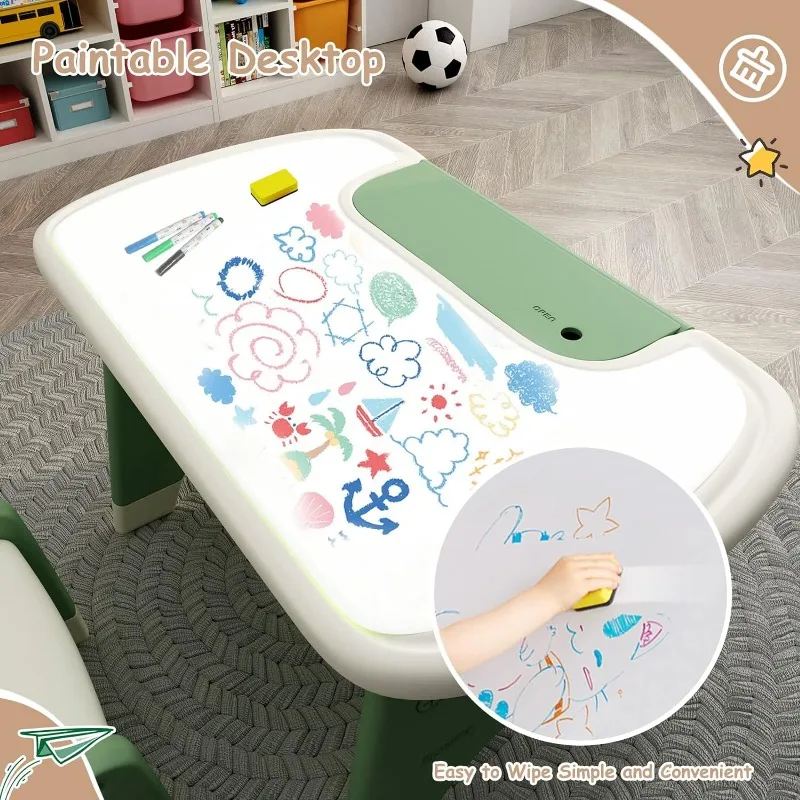 Kids Drawing Table and Chair Set with Watercolor Pen and Blackboard Eraser, Activity Table with Storage Shelf, Toddler Furniture