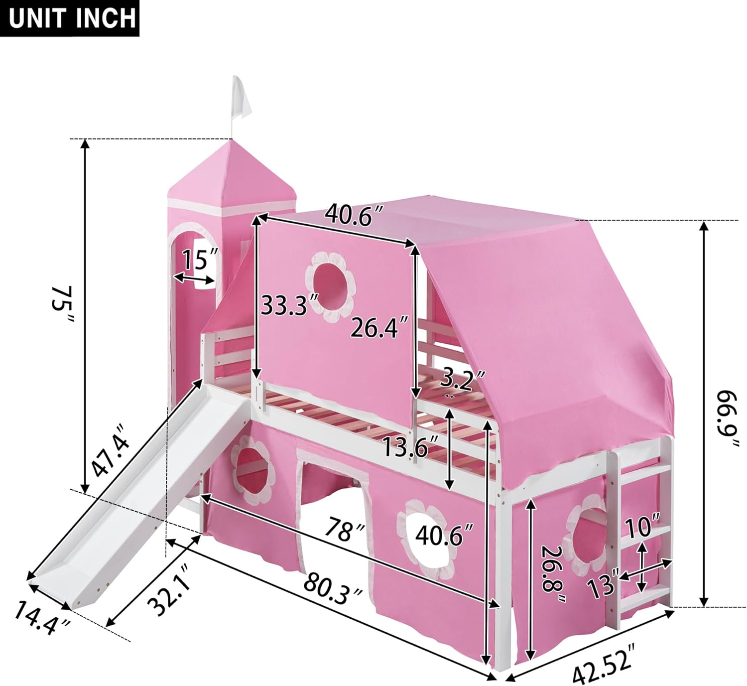 Kids Loft Bed Twin Size, House Bed For Kids With Slide, Wood Twin Kids Loft Bed With Tent, Twin Size, Pink