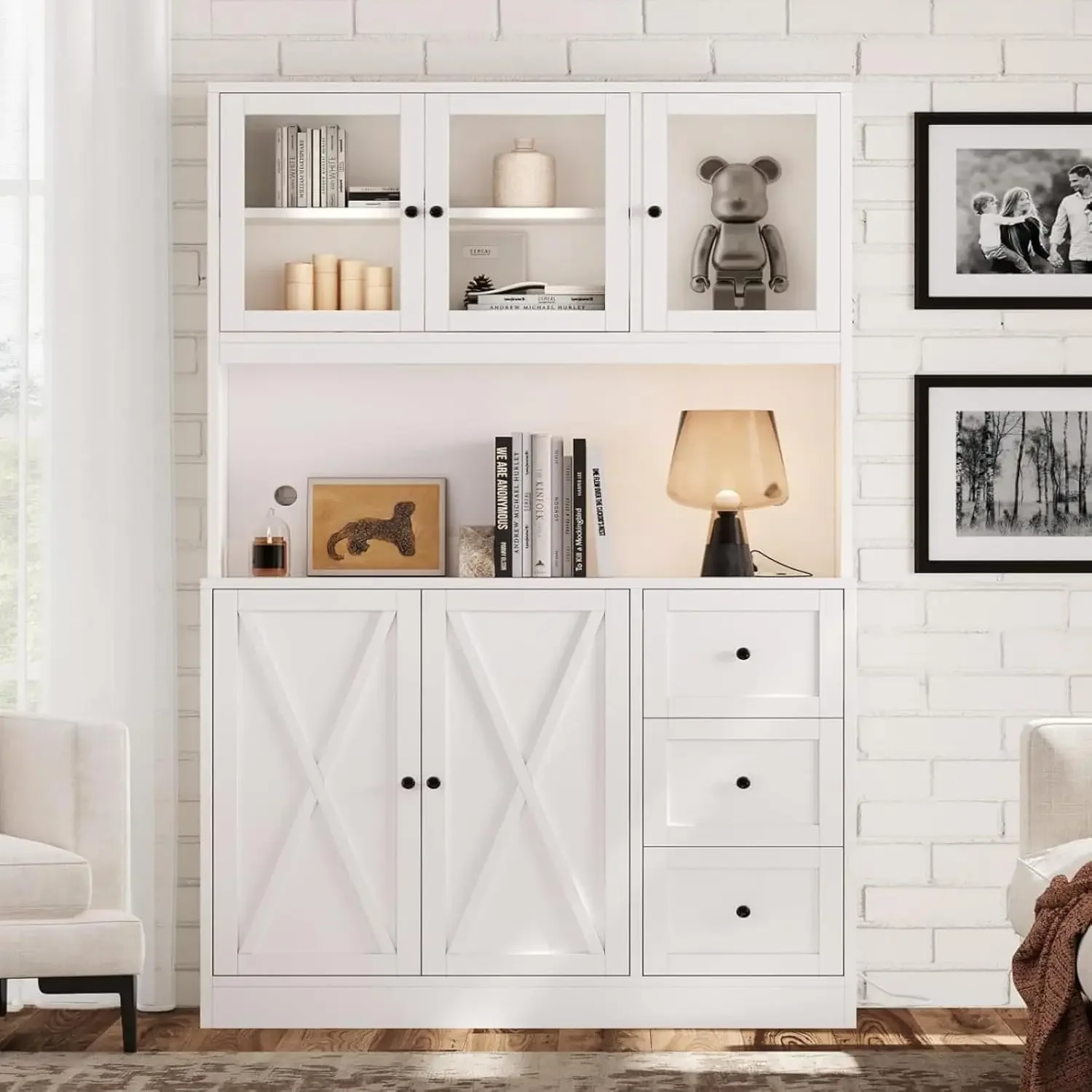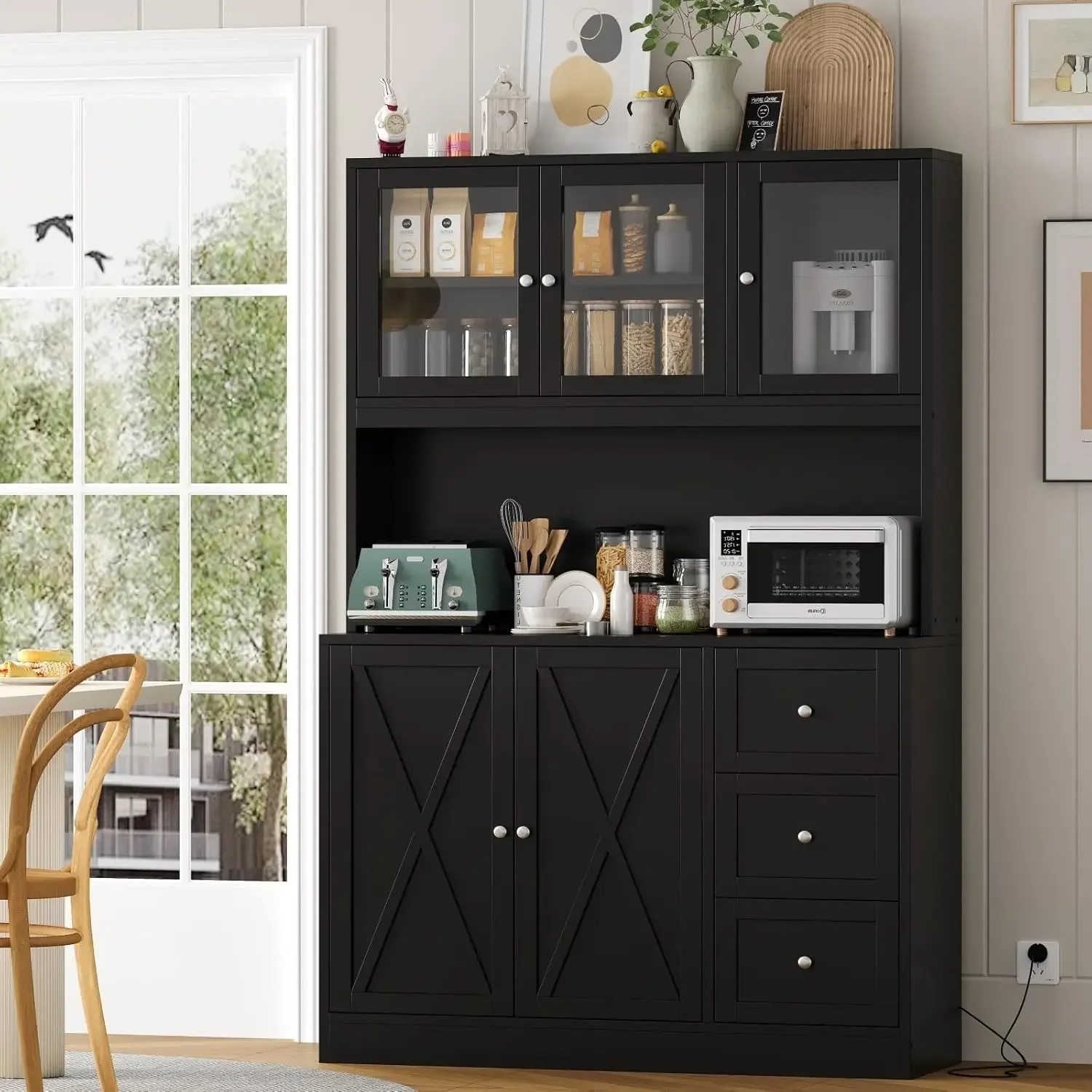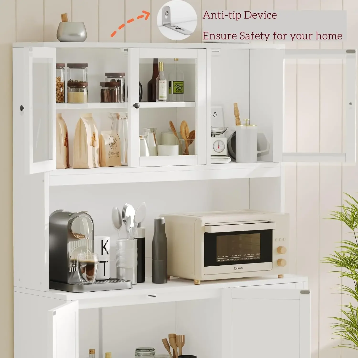 - Multifunctional Purpose: This tall cupboard cabinet not only can be a hutch cabinet in kitchen, but also a buffet sideboard cabinet, coffee bar cabinet or wine rack cabinet in the dining room to store cans, tableware and wine, a storage cabinet or display cabinet, which is suitable for living room or entryway to store books, trophies, collections and decorations