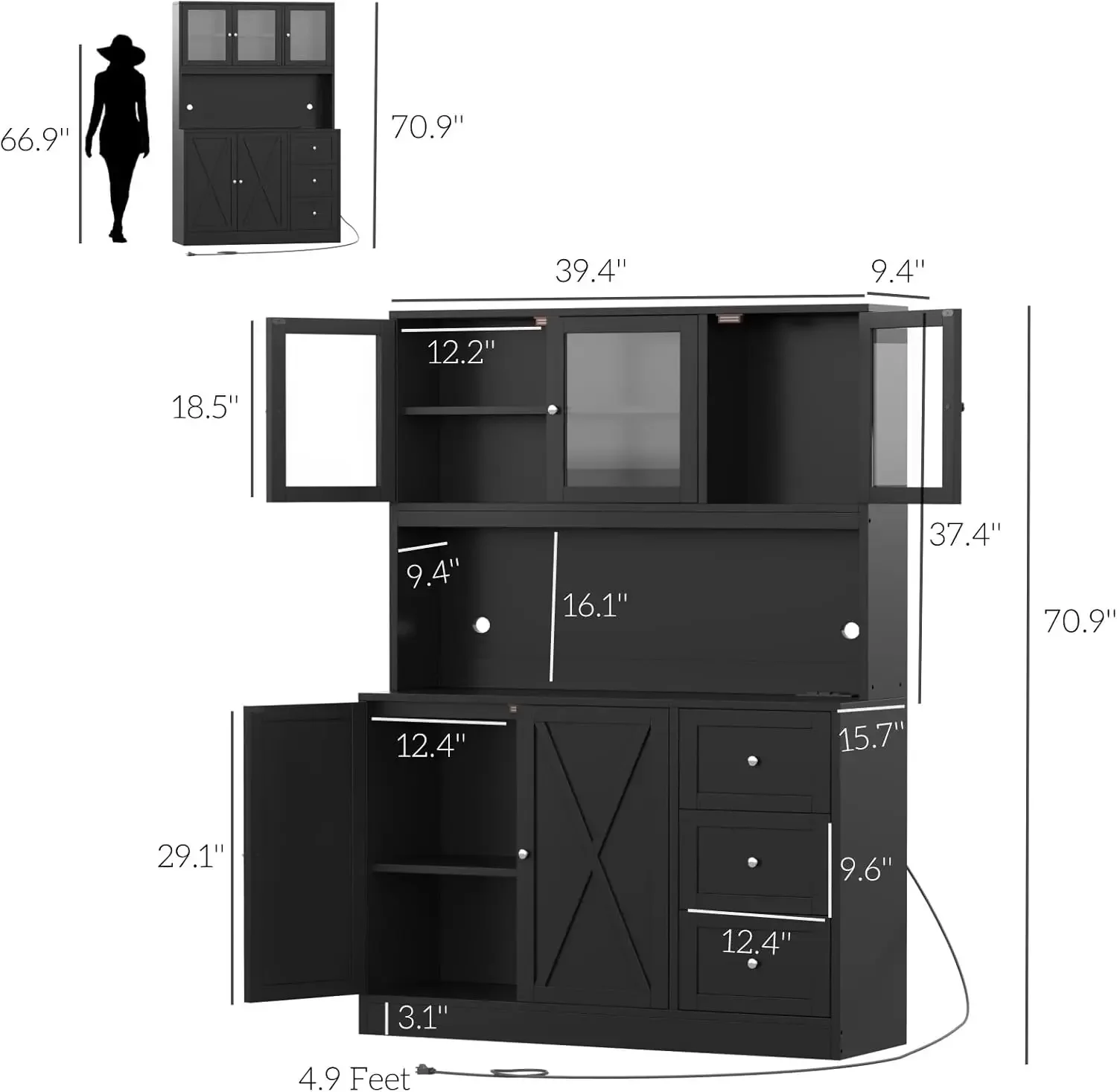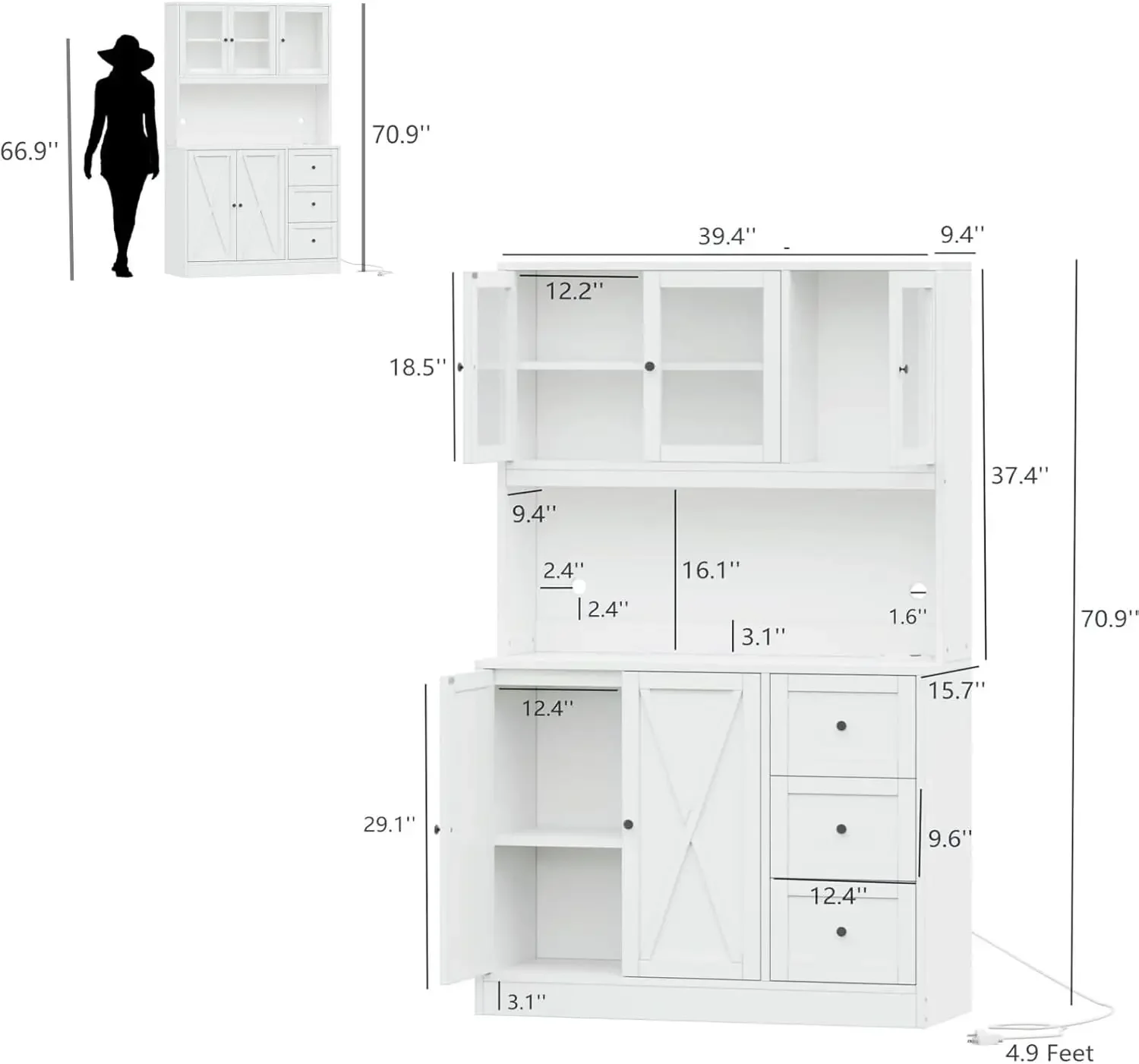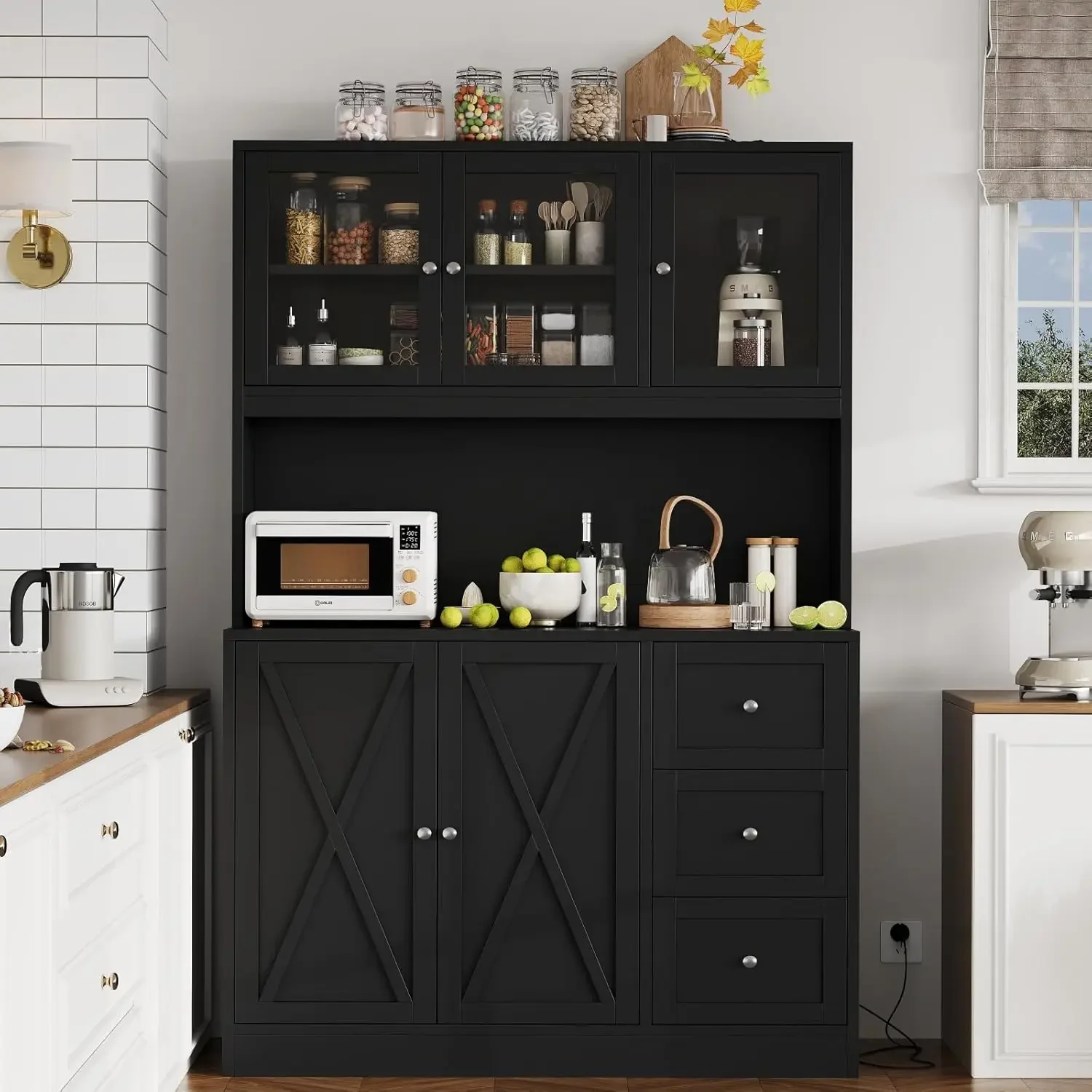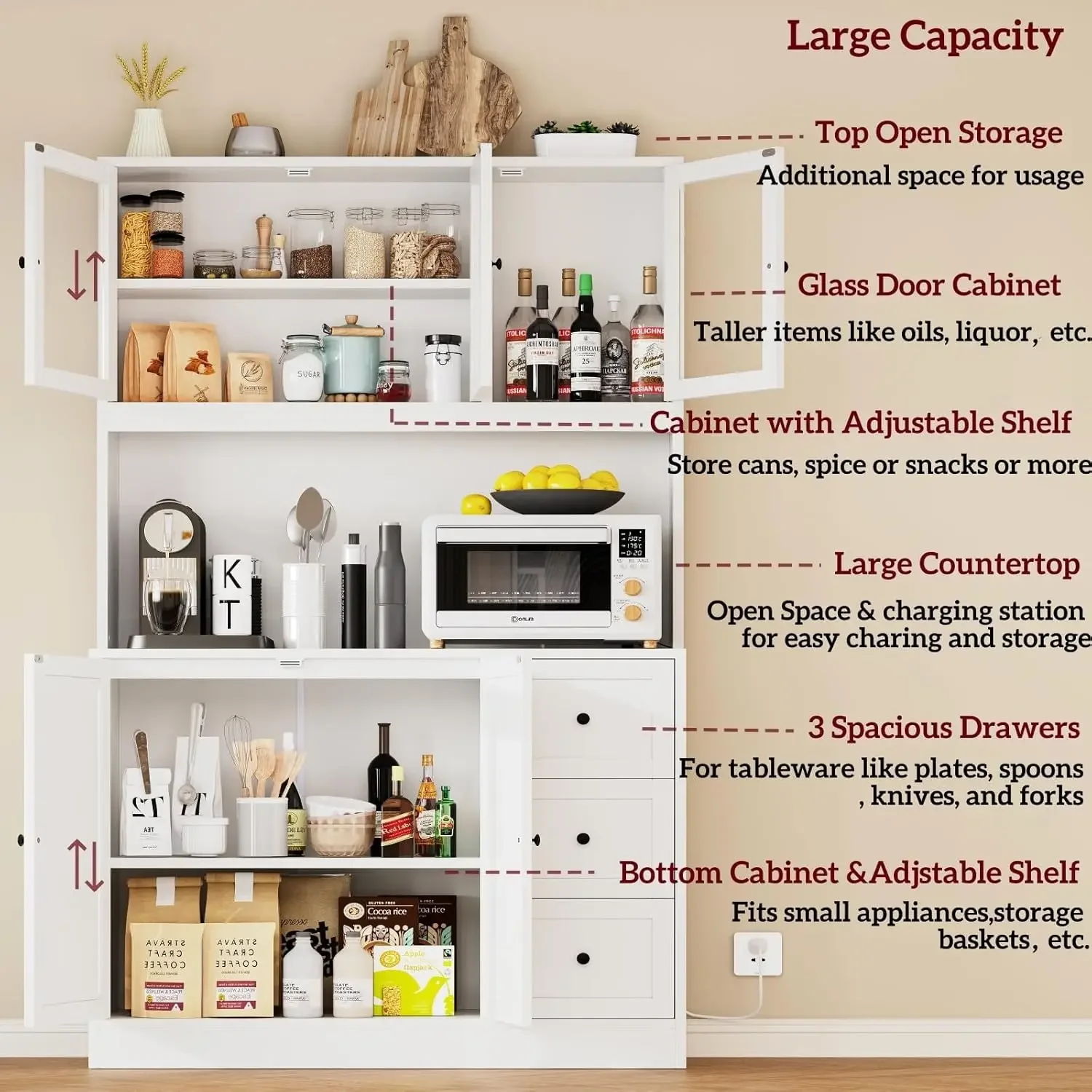 - Upgrade Your Kitchen Storage: Keep everything in a storage option! This pantry cabinet is designed with visible upper glass doors for cans. As for the upper right cabinet, the taller item suits well. Spacious countertop can accommodate microwave, coffee maker, toaster. Besides this, the bottom cabinet with adjustable shelf and 3 drawers provide more choice for dinnerware,etc.