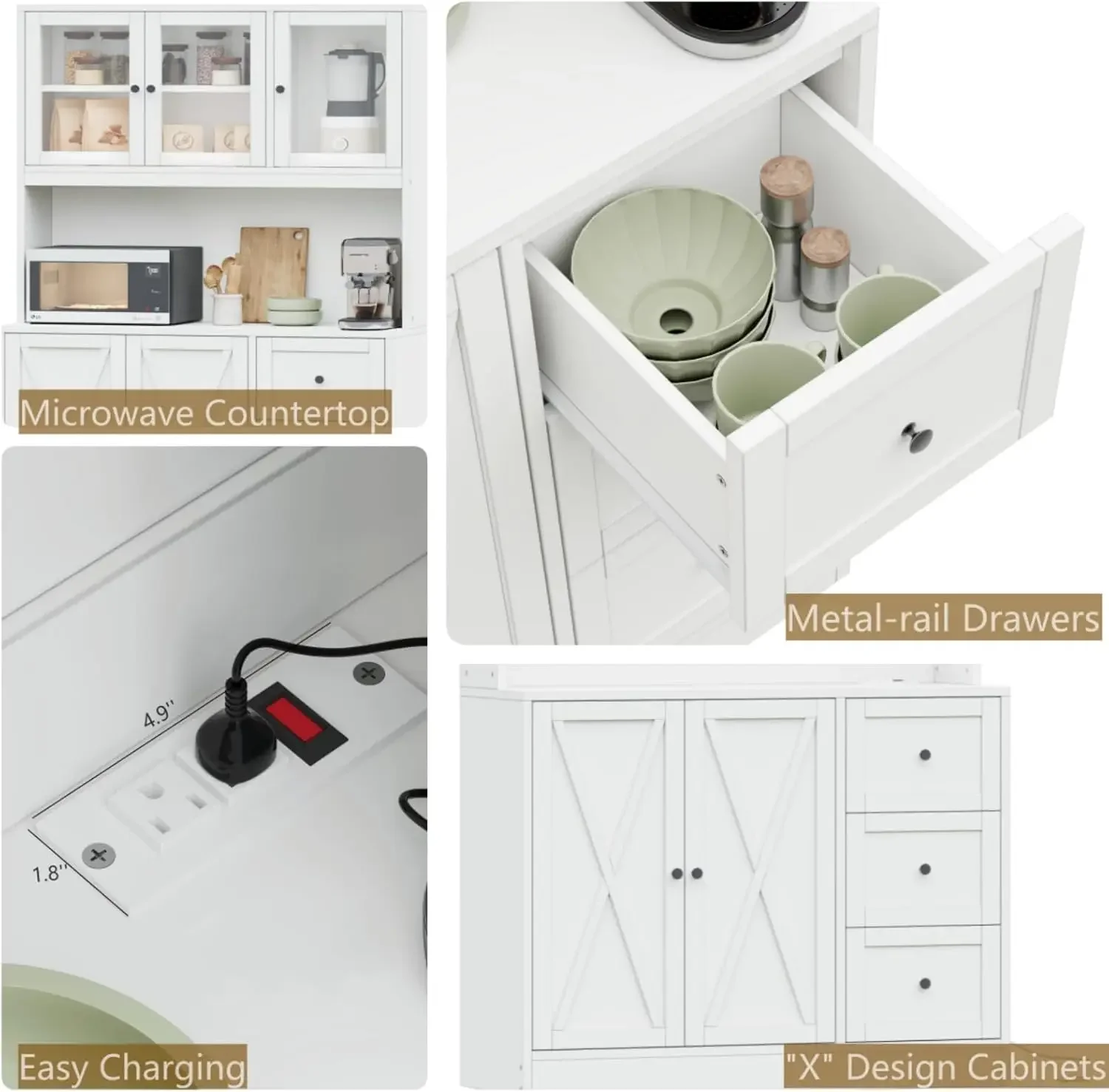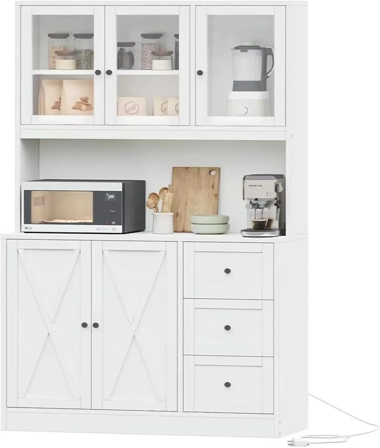 Kitchen Cabinet, Hutch with Microwave Stand & Charging Station, Cabinet with Drawer and Glass Doors, Cabinets Kitchen