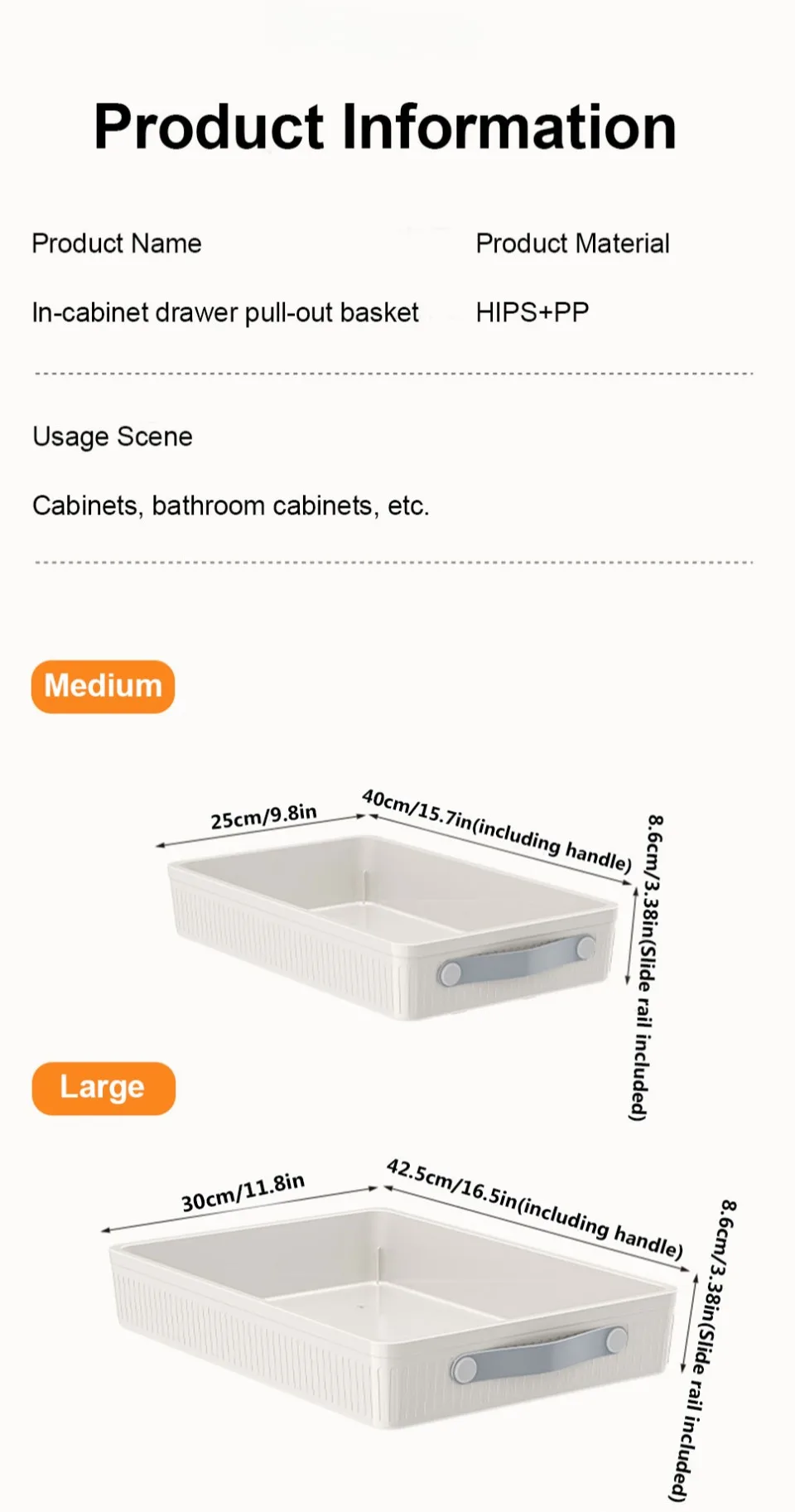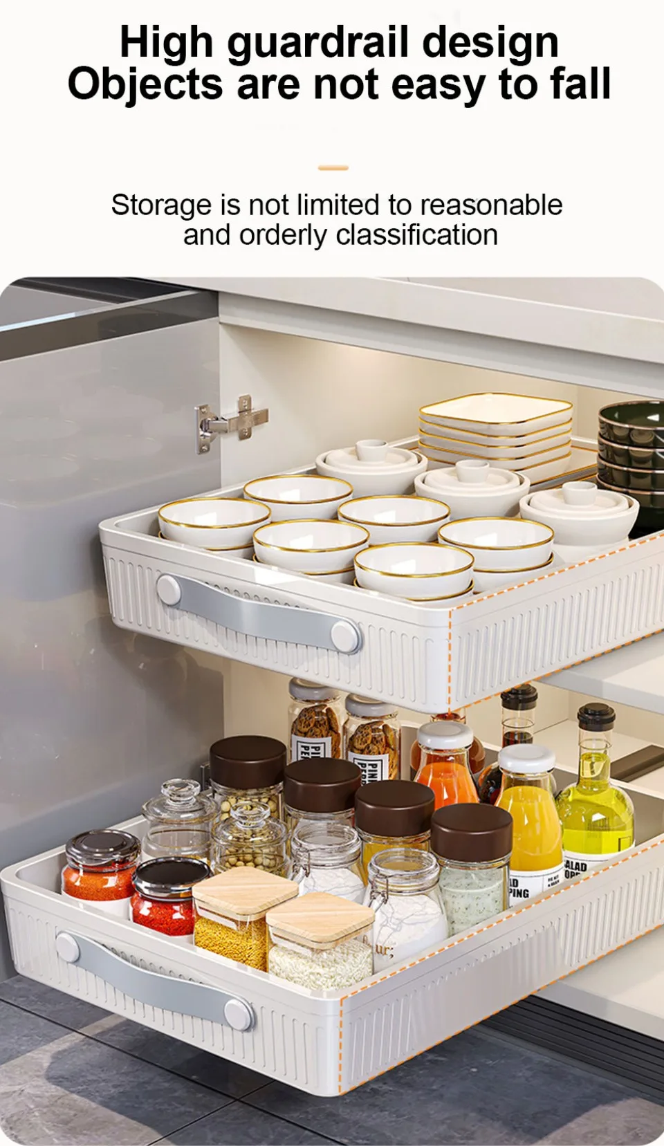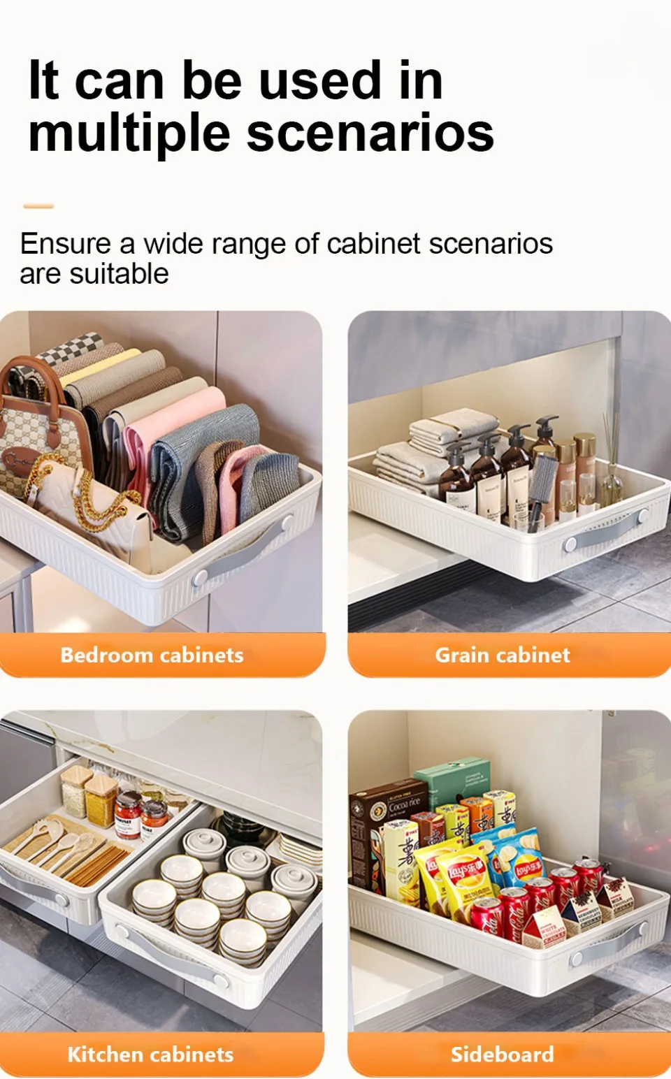 *2.The drawer cabinet sliding multifunctional organizer is a dimension of external kitchen organizer, suitable for different cabinets. The external drawers of cabinets are not only suitable for cabinet and kitchen storage, but also for food storage and some loose items