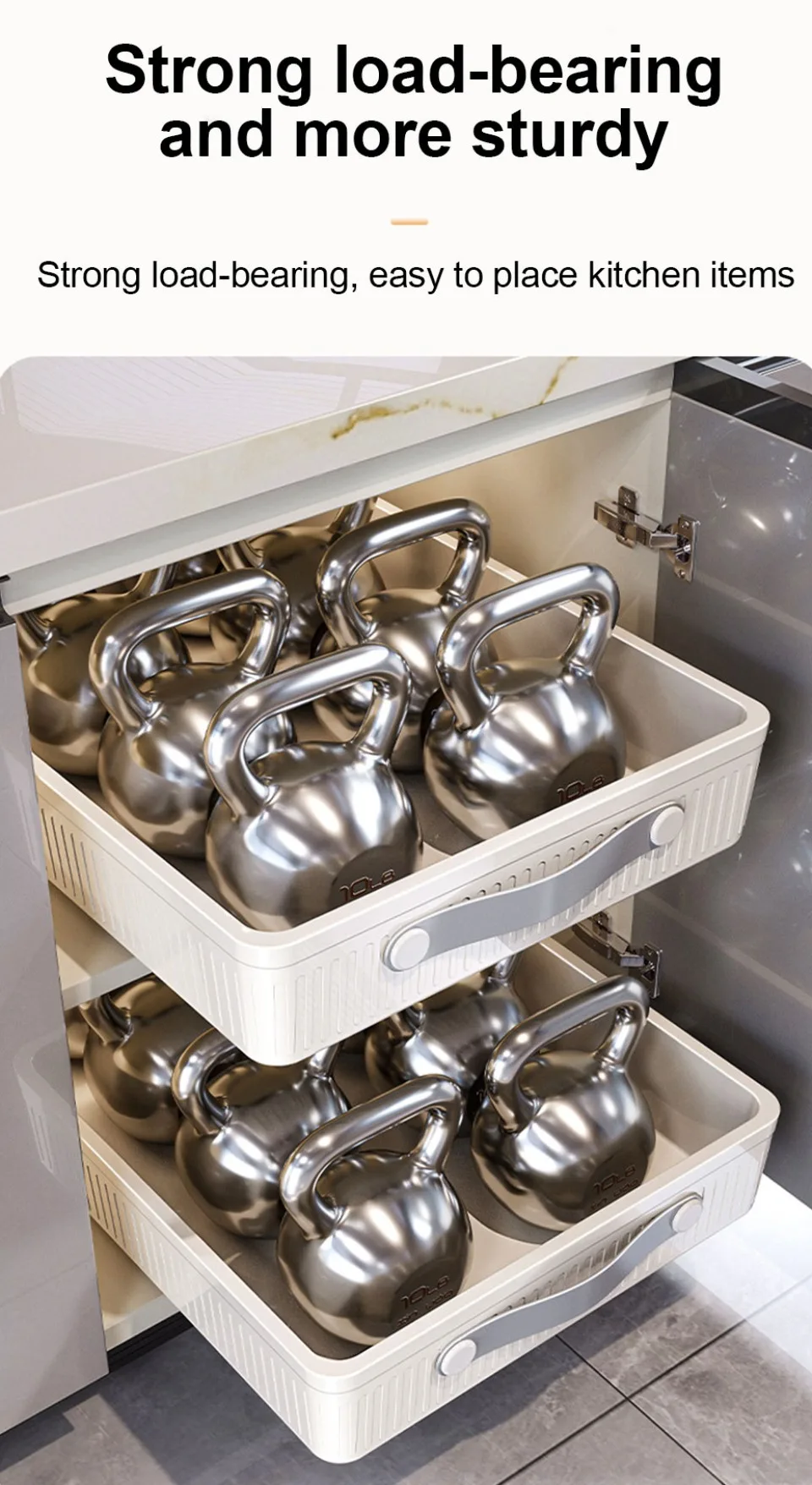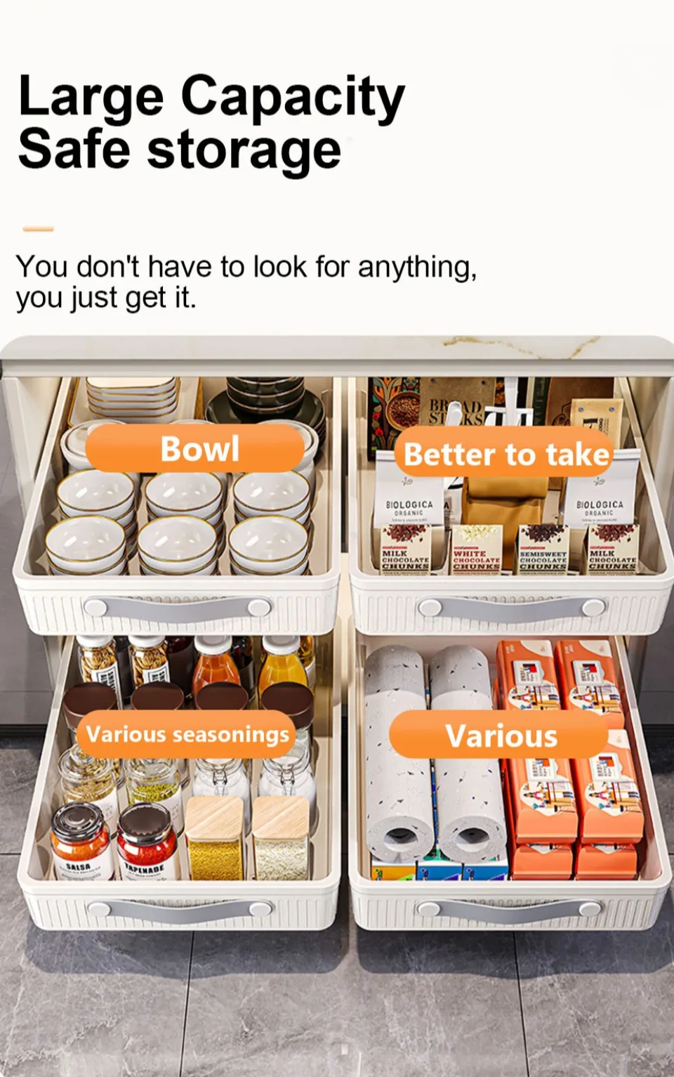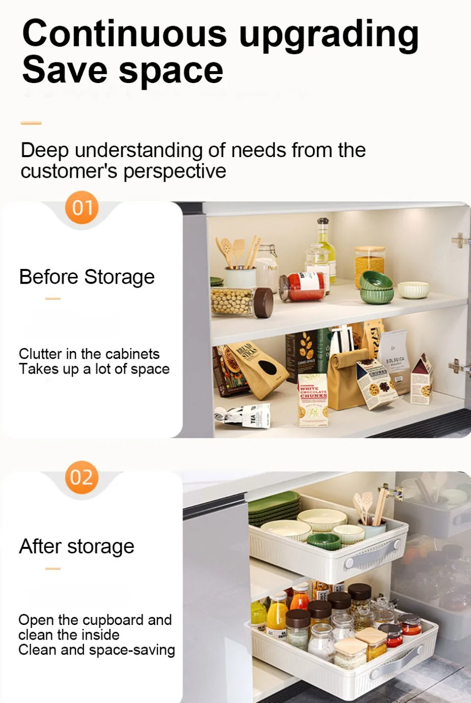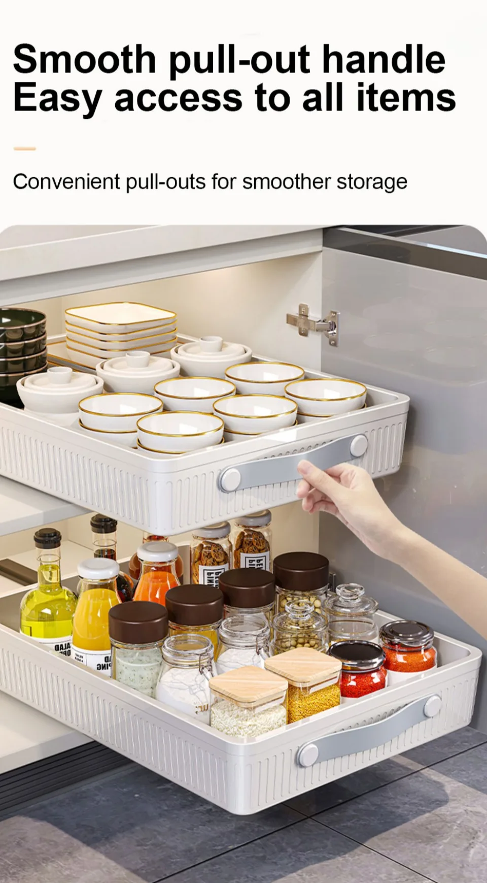 *2.The drawer cabinet sliding multifunctional organizer is a dimension of external kitchen organizer, suitable for different cabinets. The external drawers of cabinets are not only suitable for cabinet and kitchen storage, but also for food storage and some loose items