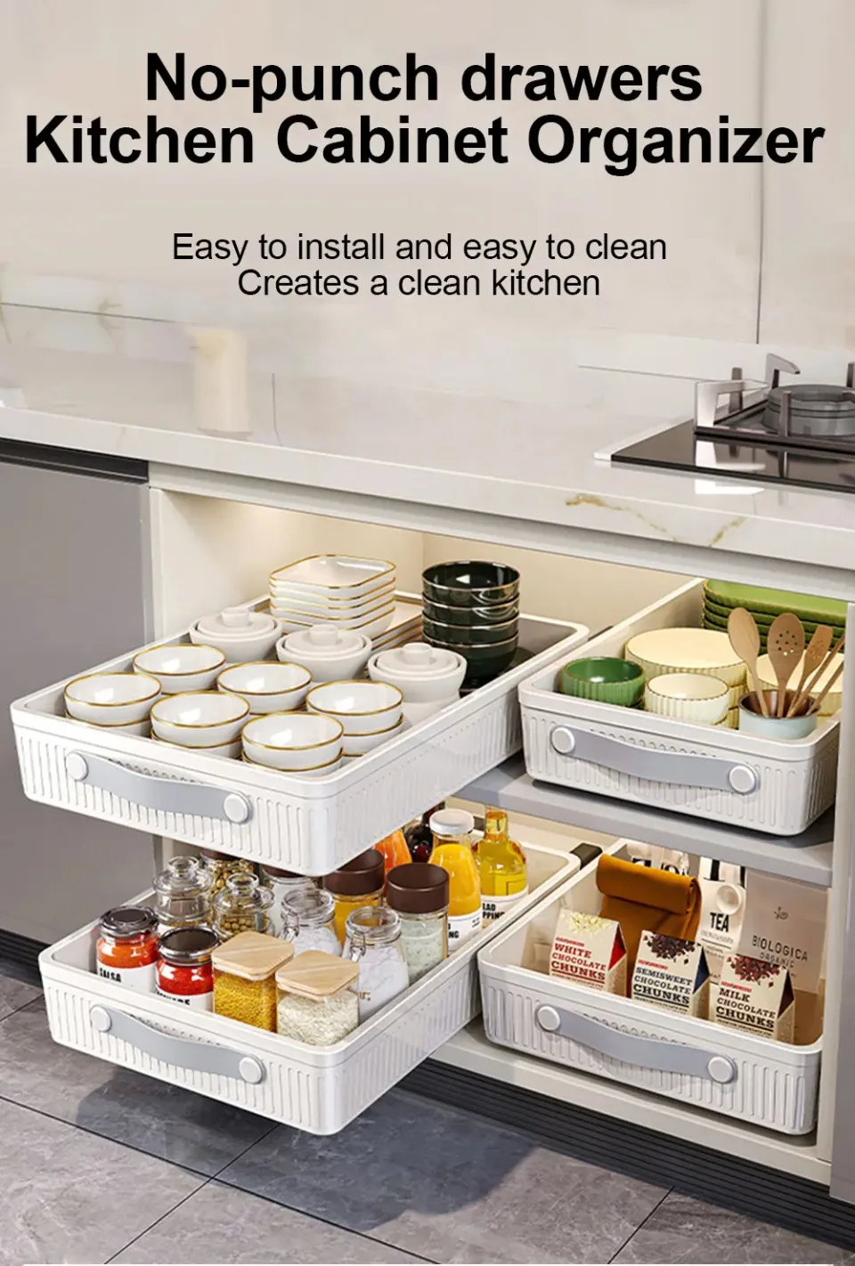*4.Easy to install (no need for drill bits and nails) – This drawer is easy to install without the need for tools to drill and tighten! The new nylon adhesive design makes installation easier while providing excellent stability. Very suitable for organizing kitchen storage