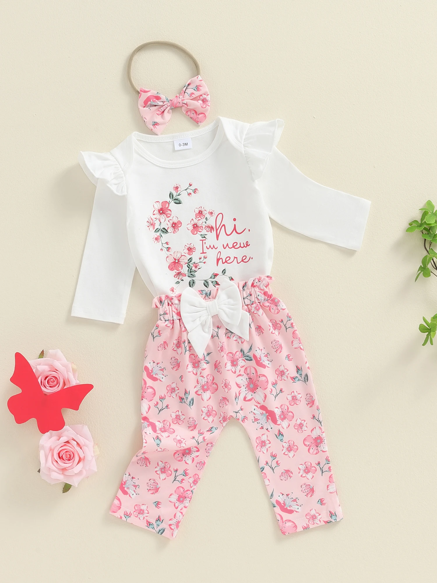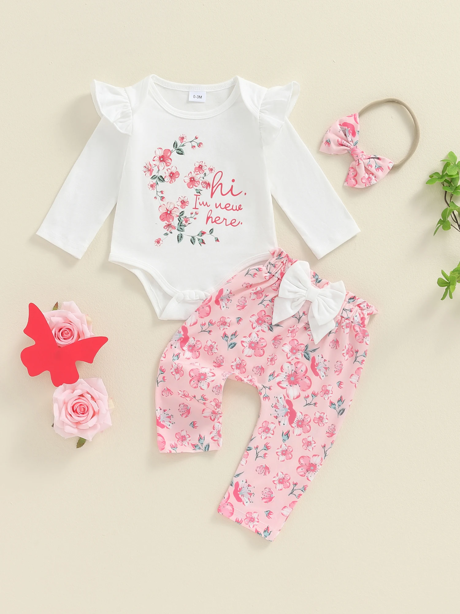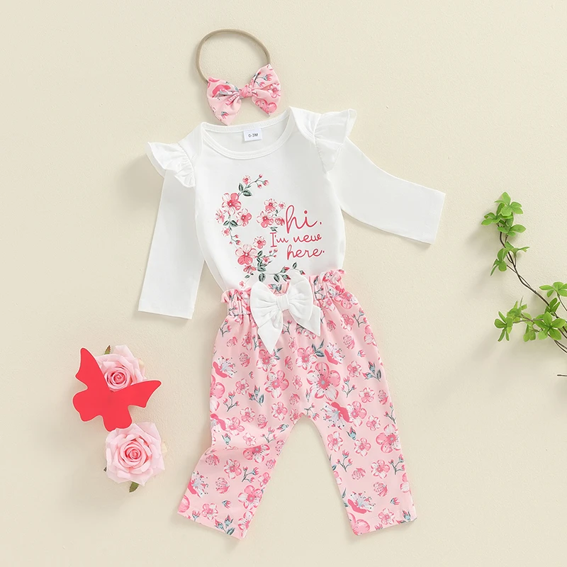 KMBANGI Newborn Baby Girls Outfit “Hi I’m New Here” Ruffle Long Sleeve Crew Neck Bodysuit Floral Pants Headband 3PCS Set