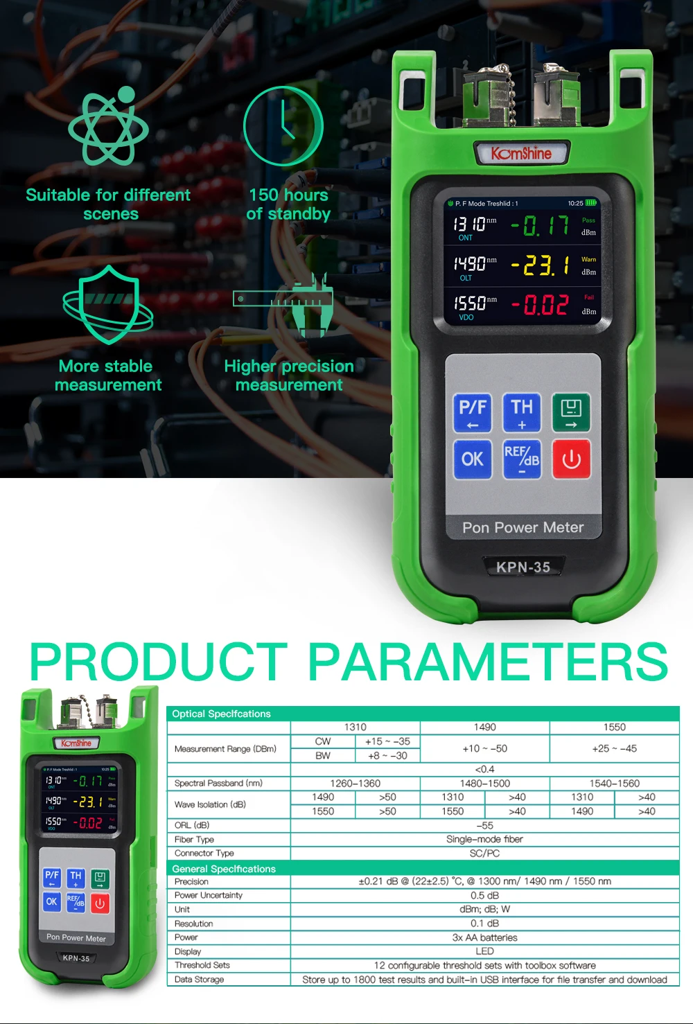 The KPN-35 is a passive optical network (PON) power meter, which enables the user to quickly validate PON network installations. This compact test equipment is able to measure all three EPON wavelengths ( 1310 nm, 1490 nm, 1550 nm ) simultaneously, with user defined pass/ fail thresholds to simplifyinterpretation. Results can be downloaded to a PC for further analysis..