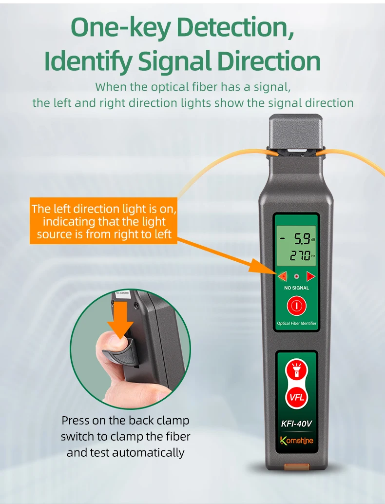 The KomShine KFI-40V Optical FiberIdentifier canquickly identify the direction of transmitted fiber and display the relative core power without any damages to thebeadedfiber. When the traffic is present, the intermittently audible tone is activated.