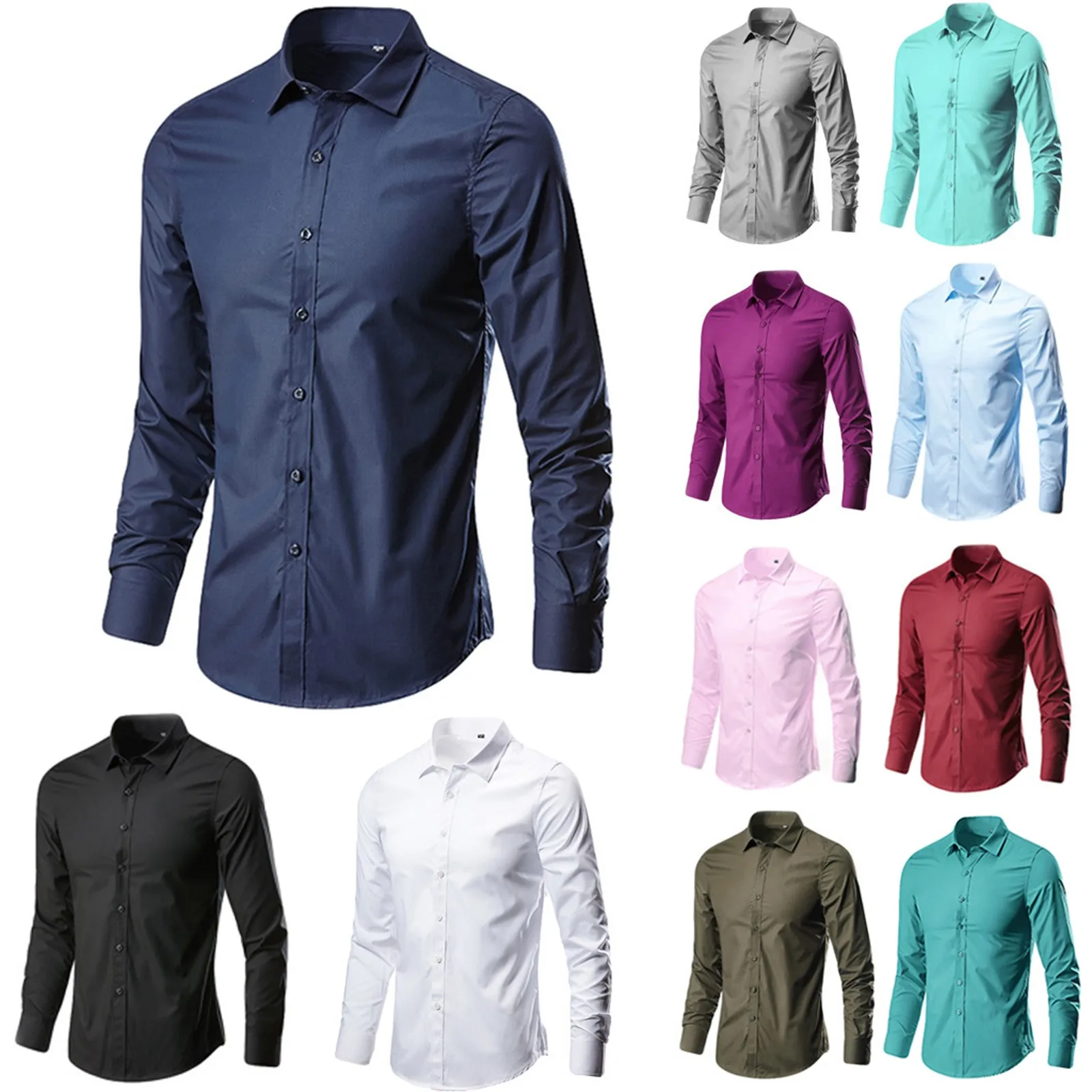 Men’s Fashion Business Leisure Lapel Pure Color Long-sleeved Shirt Top Blouse