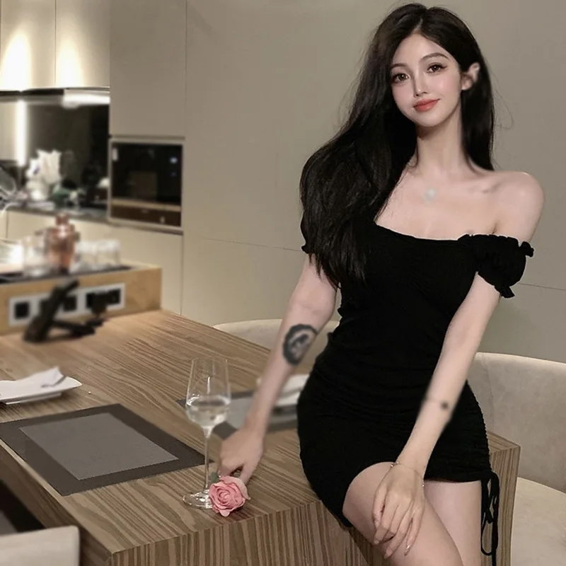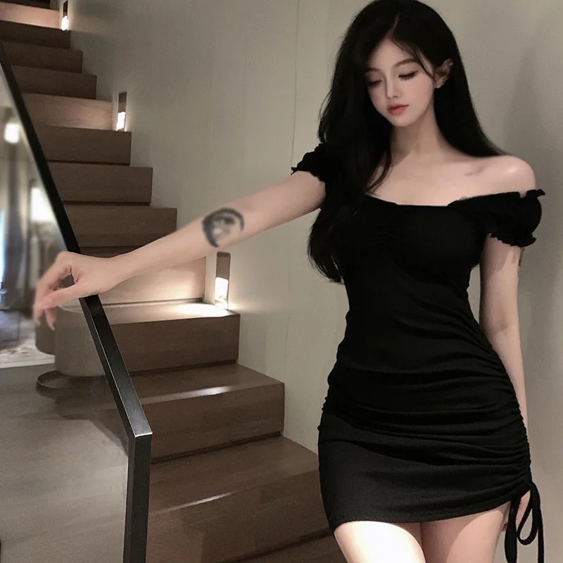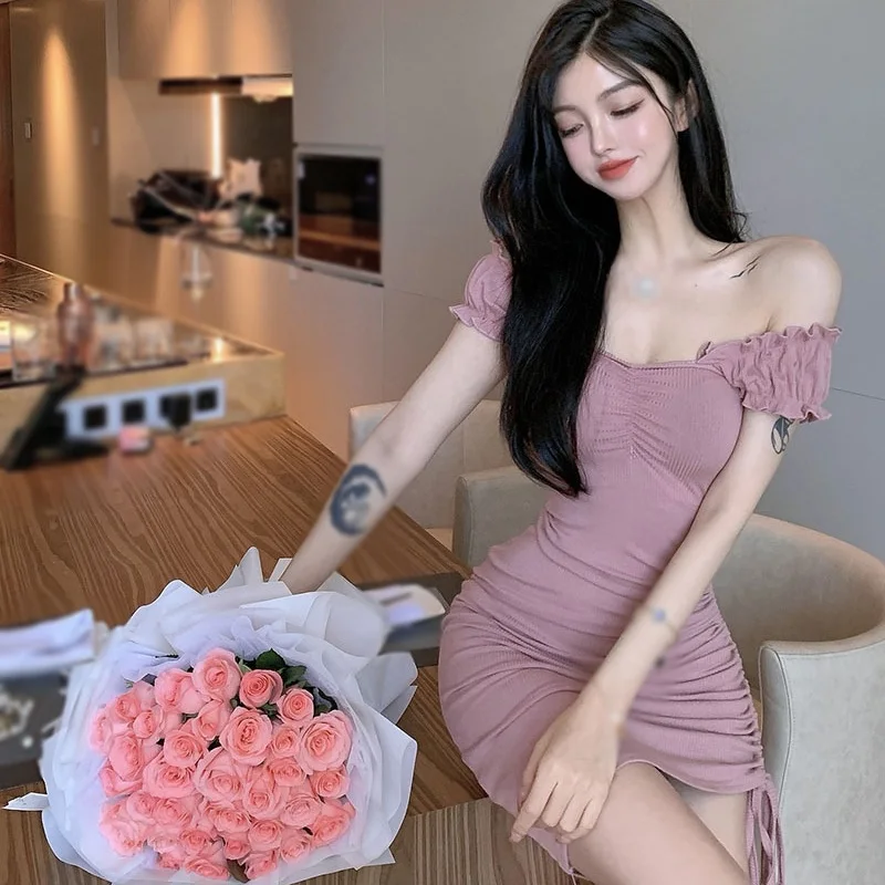 Korean Version Summer Solid Slash Neck Drawstring Design Slim Fit Sexy Short Sleeve Dresses Off Shoulder Women’s Dress