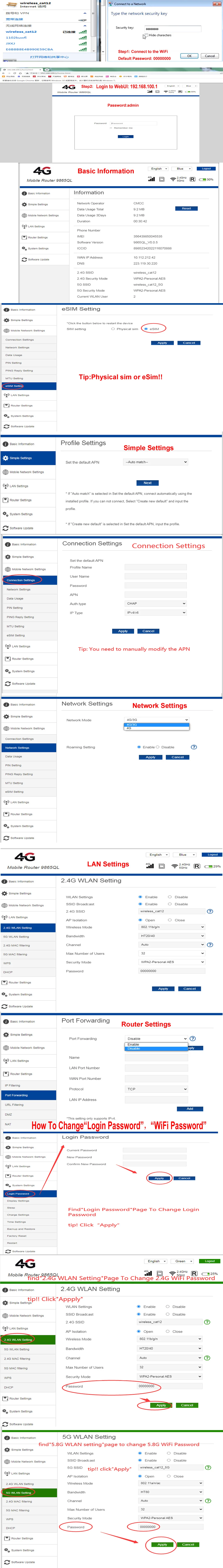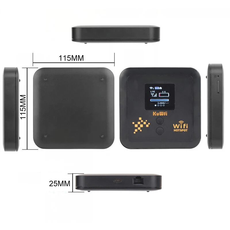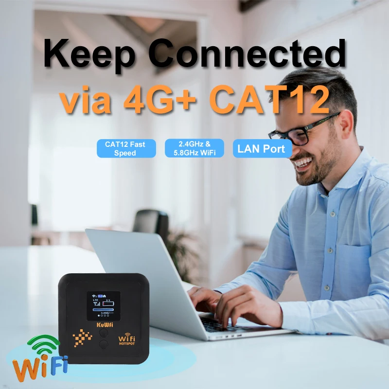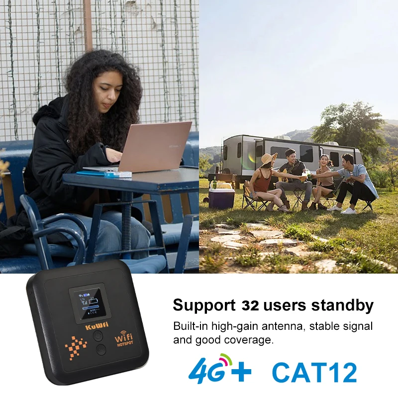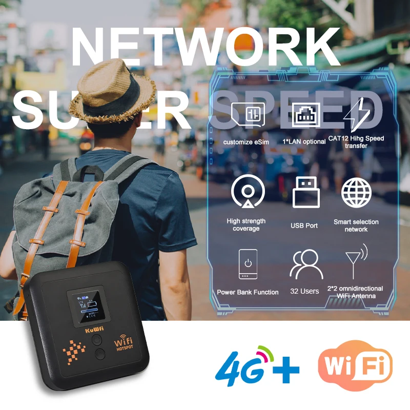 KuWFi C980 is a eSim 4G CAT 12 pocket router, meanwhile, pyhsical sim card is also supported. Dul band AX1200Mbps provide high transmission rate, cat 12 LTE speed up to 600Mbps DL and 90Mbps UL. 5400mAh battery supports long working time and stand by time, Built-in high-gain antenna, stable signal and good coverage.withing the capability of 10users supported at the same time, you can share wifi with your friend and family everywhere.