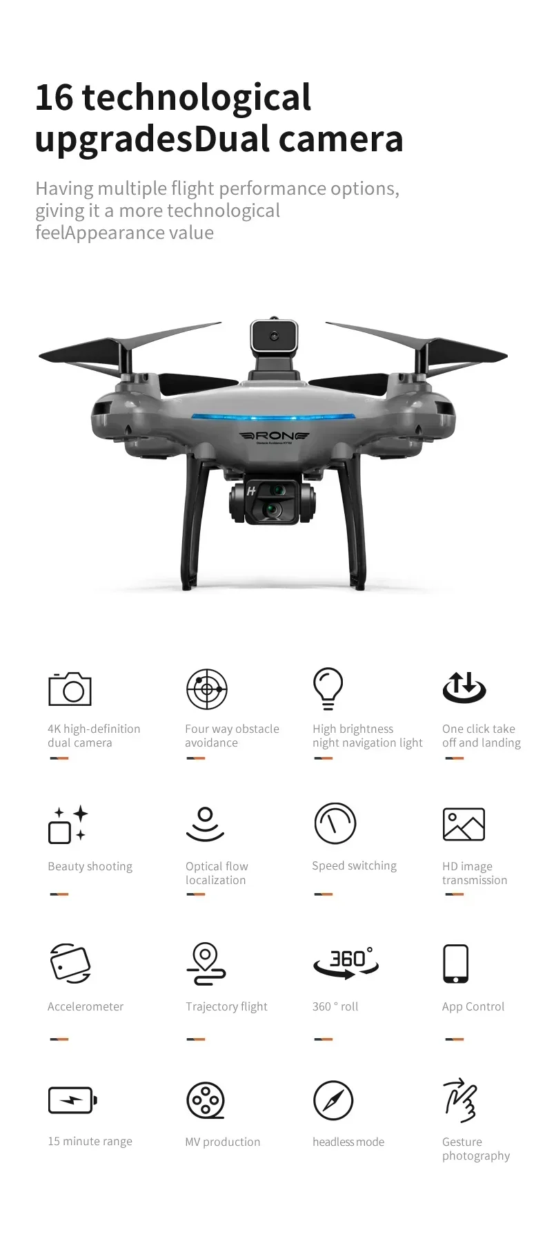 4. APP mobile phone control, one-key return, headless mode, up and down, forward and backward, left and right side flight.
