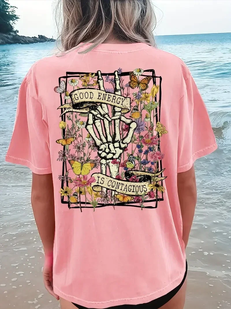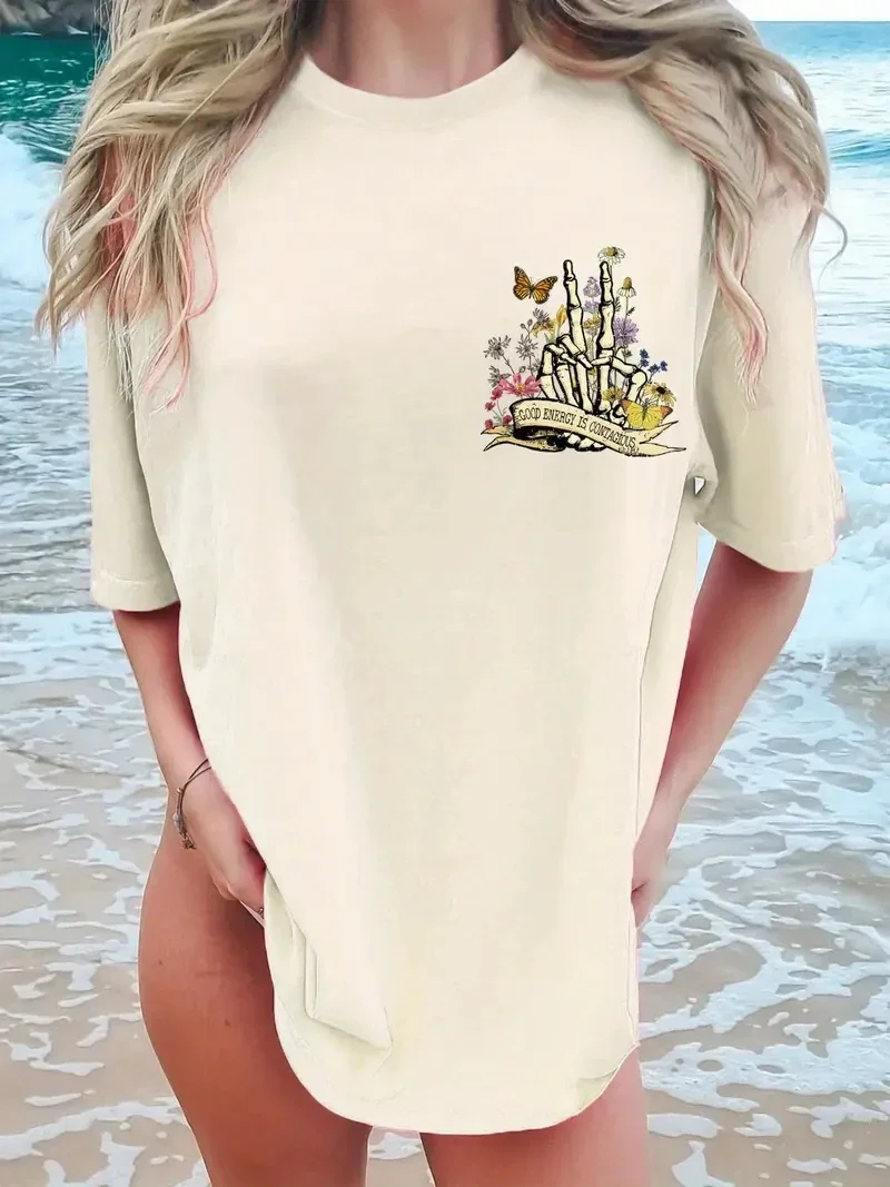 Ladies’ Plus Size Comfortable Simple Castle Style Skull Print Round Neck Short Sleeved Fashionable T-shirt