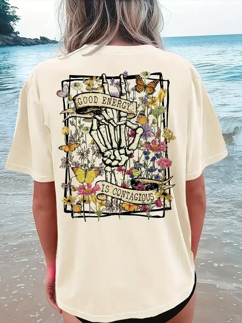 Ladies’ Plus Size Comfortable Simple Castle Style Skull Print Round Neck Short Sleeved Fashionable T-shirt