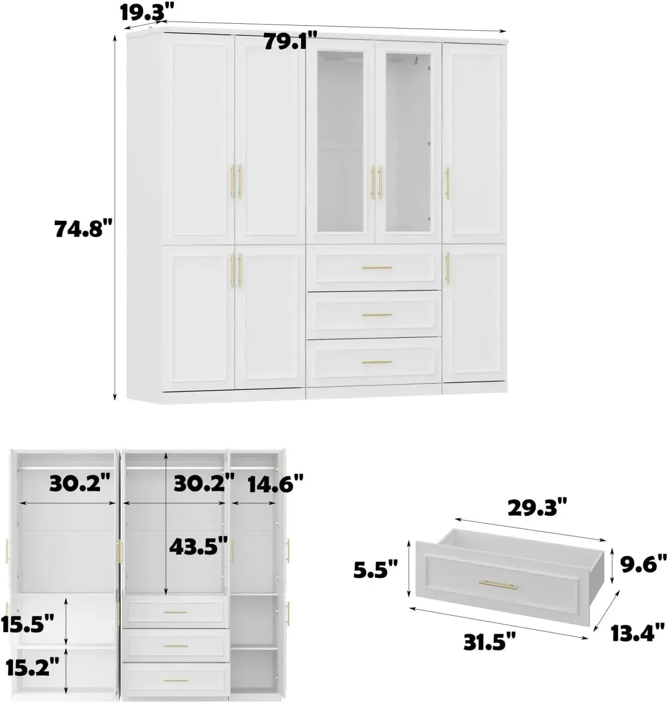 Large Armoire Wardrobe Closet Collection with Drawers & Hanging Rods, Wardrobe Armoire with Gold Metal Handles