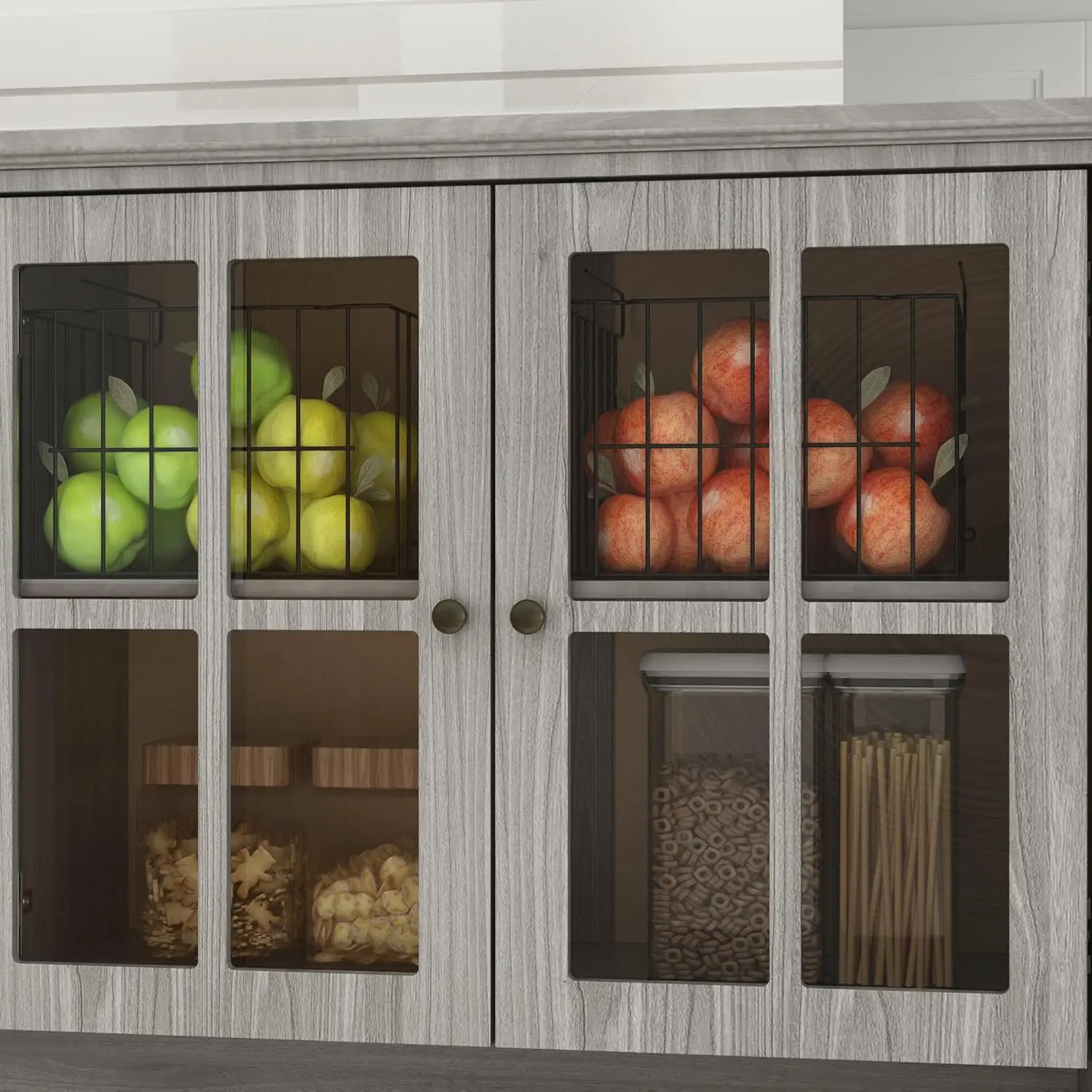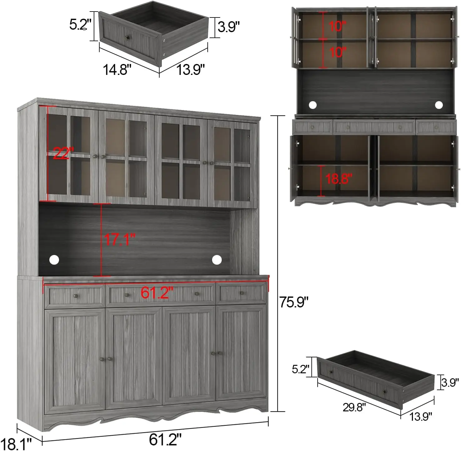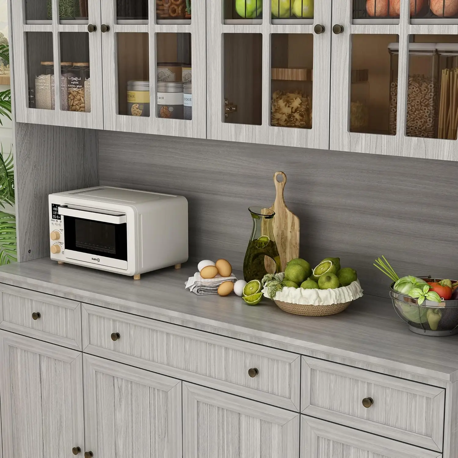 - [Designed Details] – The kitchen cupboard matches grey panels with grains to show elegant charm, the carved bottom will add vintage charm, this cabinet will fit easily at your home. You can store or display dishware, microwave, spices, wines, books, collections, flower vase and so on