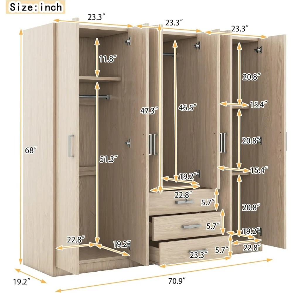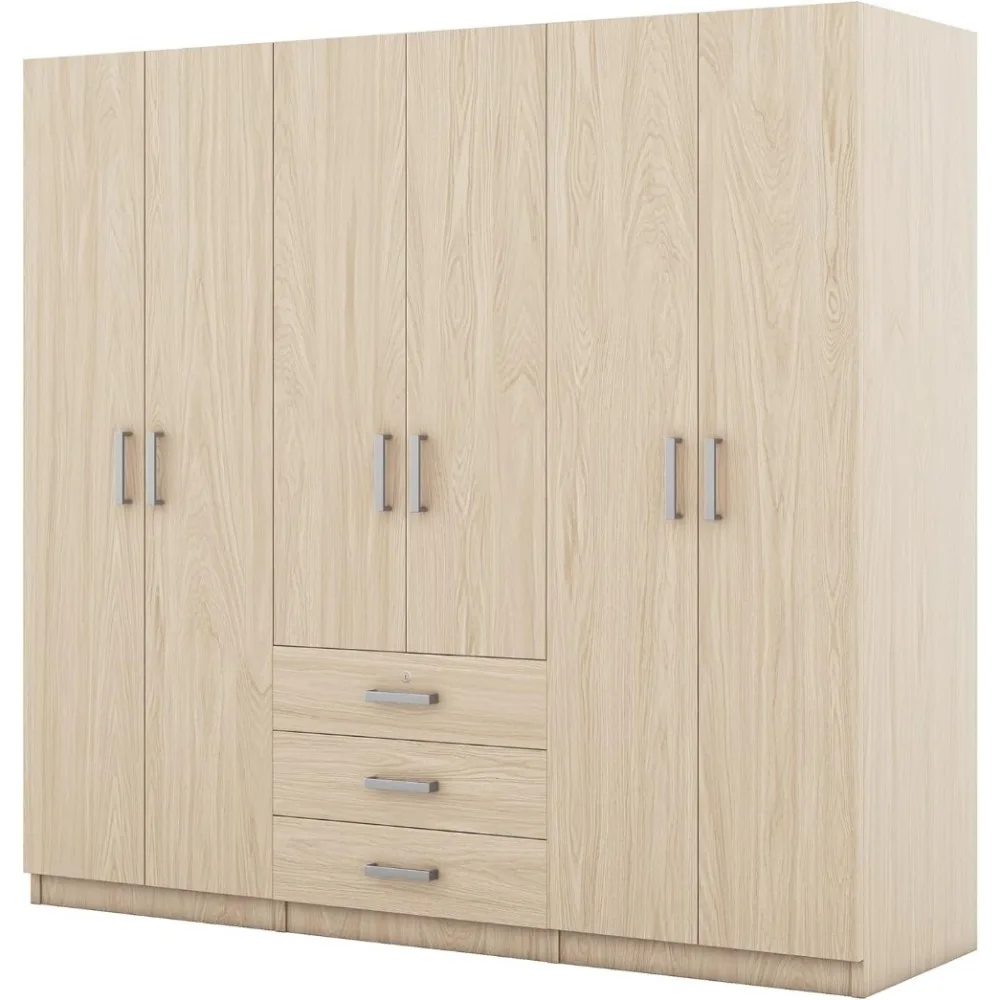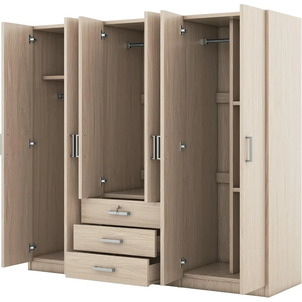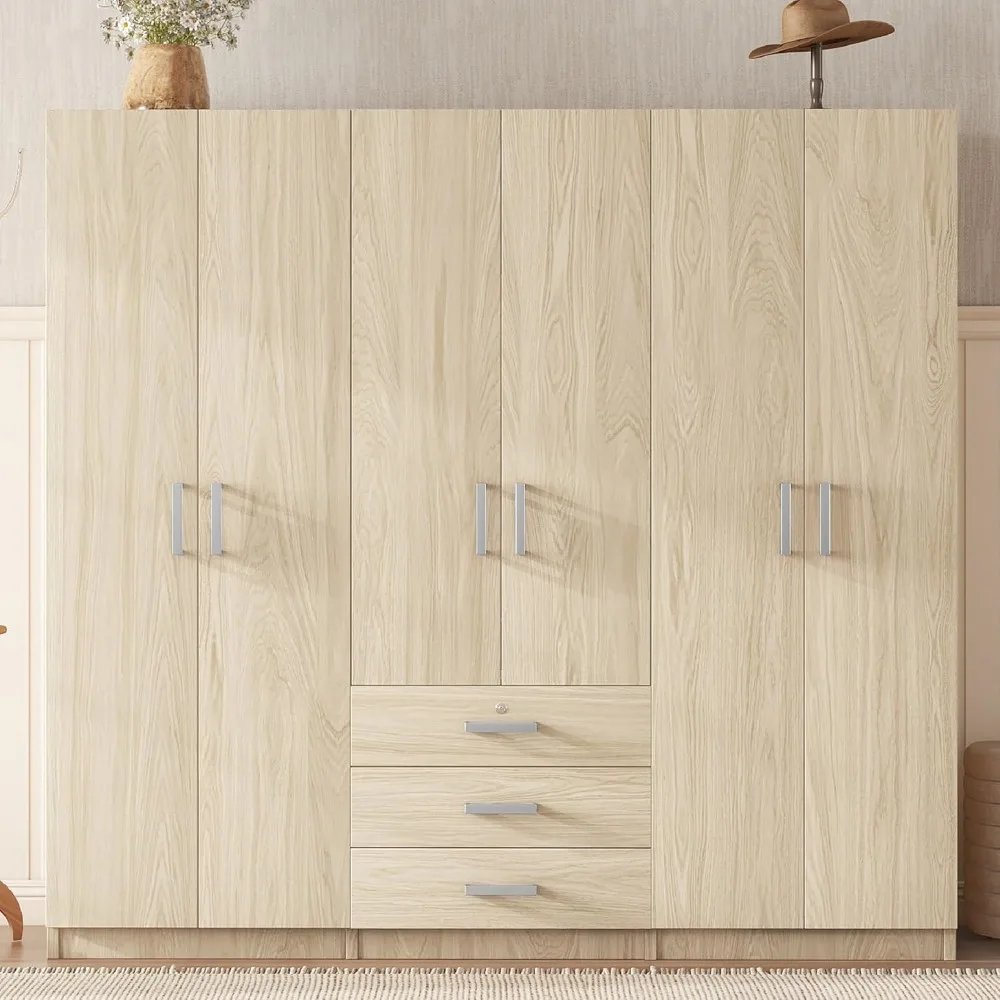 Large Natural 6 Doors Wooden Wardrobe Closet Organizer, Bedroom Tall Armoire with Big Drawers, Hanging Rails and Shelves, Brown
