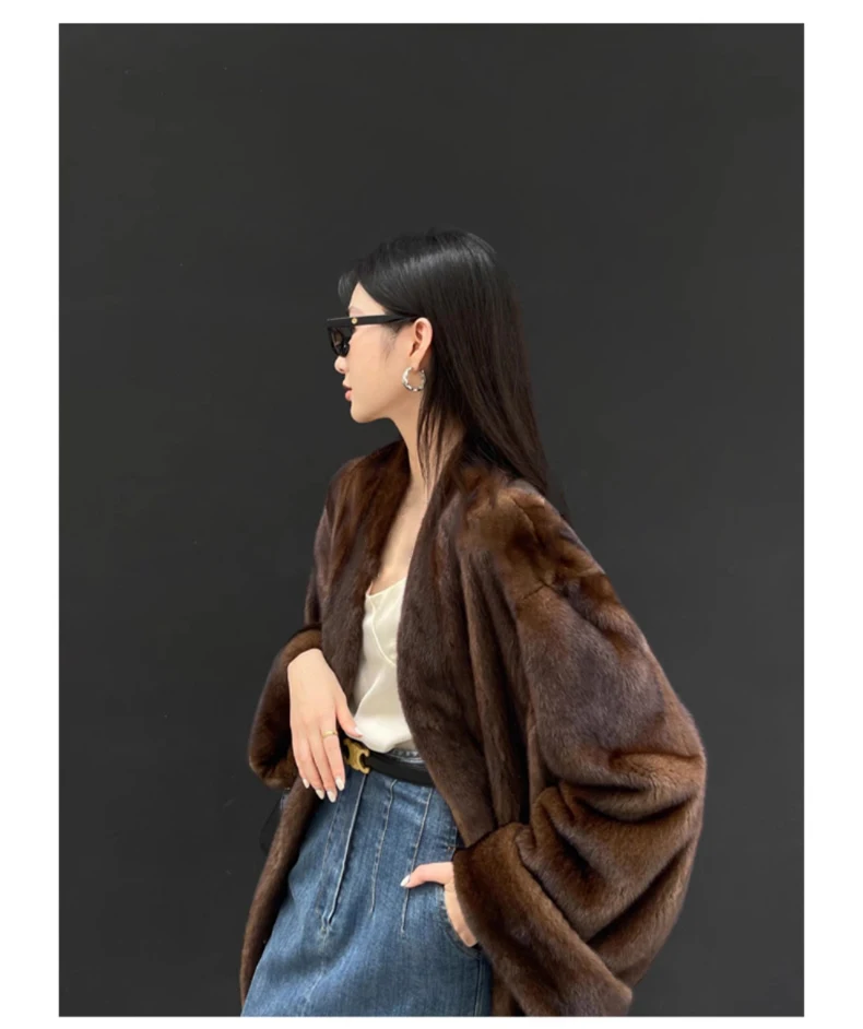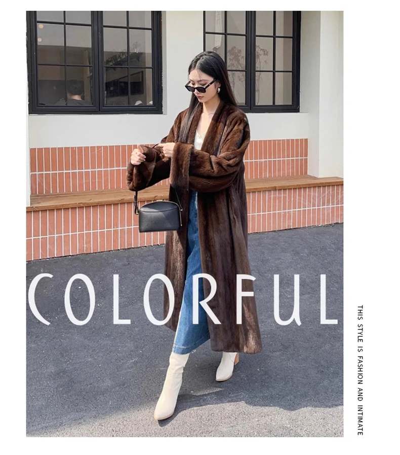Lautaro Winter Long Vintage Elegant Luxury Chic Thick Warm Soft Brown Fluffy Faux Mink Fur Coat Women V Neck Furry Overcoat 2023