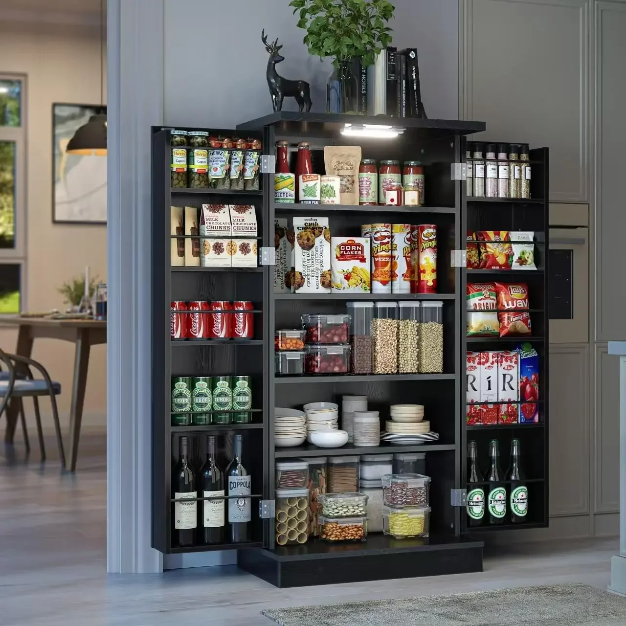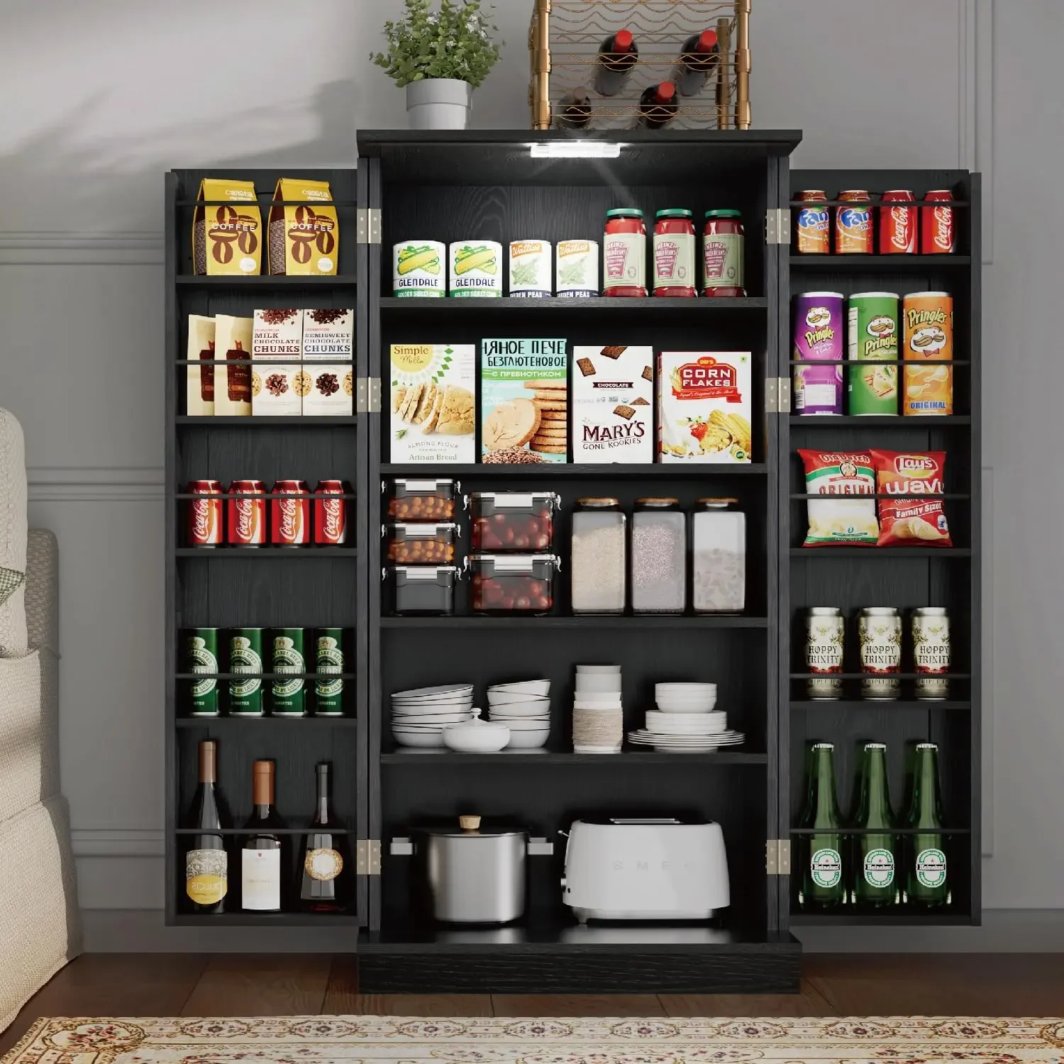 - 【Smart LED Light】Illuminate your kitchen with our energy-efficient and time-saving smart pantry cabinets. The intuitive LED light automatically turns on when the door is opened, and the convenient USB port provides power for your devices. Perfect for storing food day or night