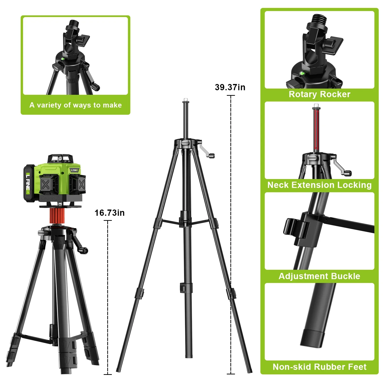 the tripod is made of high quality material it is stable and durable. It can reach 39.37 inches when fully unfolded, and the flip lock design allows height adjustment arbitrarily. Measures only 16.73 inches when collapsed for easy storage. In addition to the regular 1/4" quick release plate, a 5/8" adapter is included, you can install and remove the laser level in seconds.
