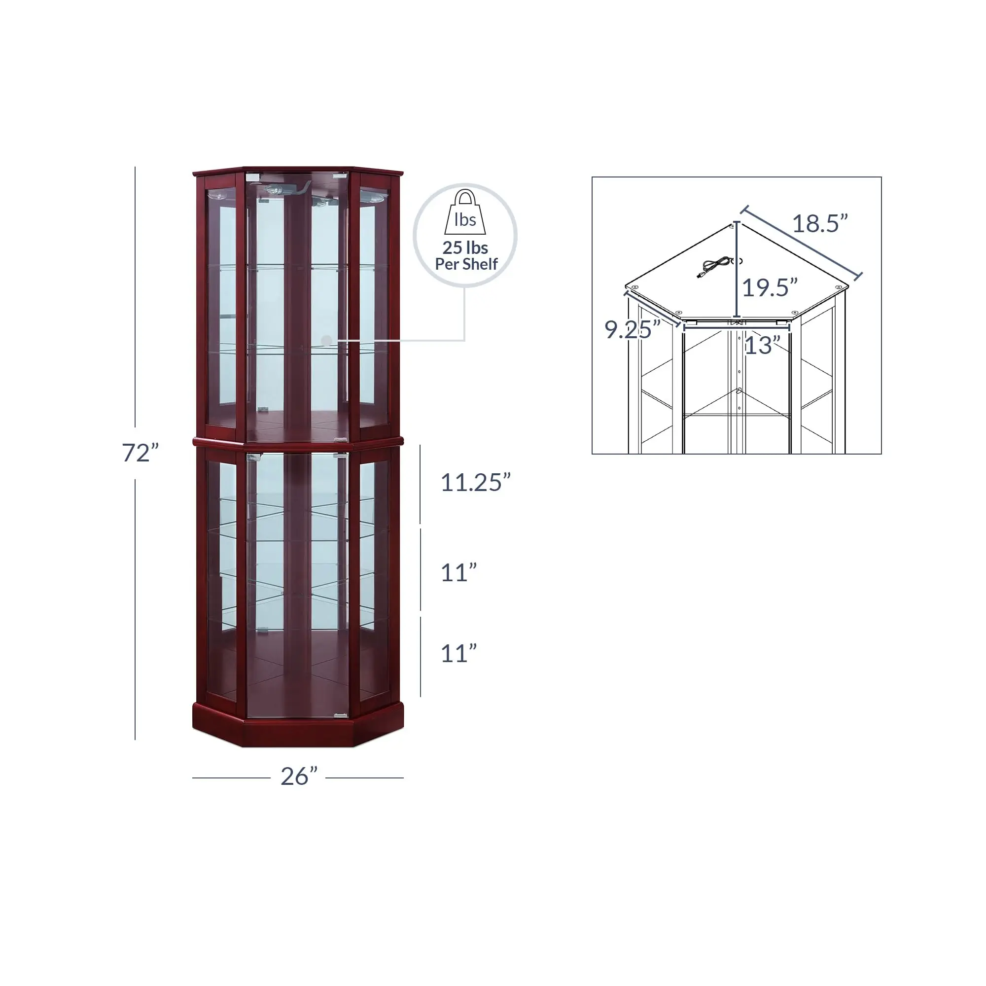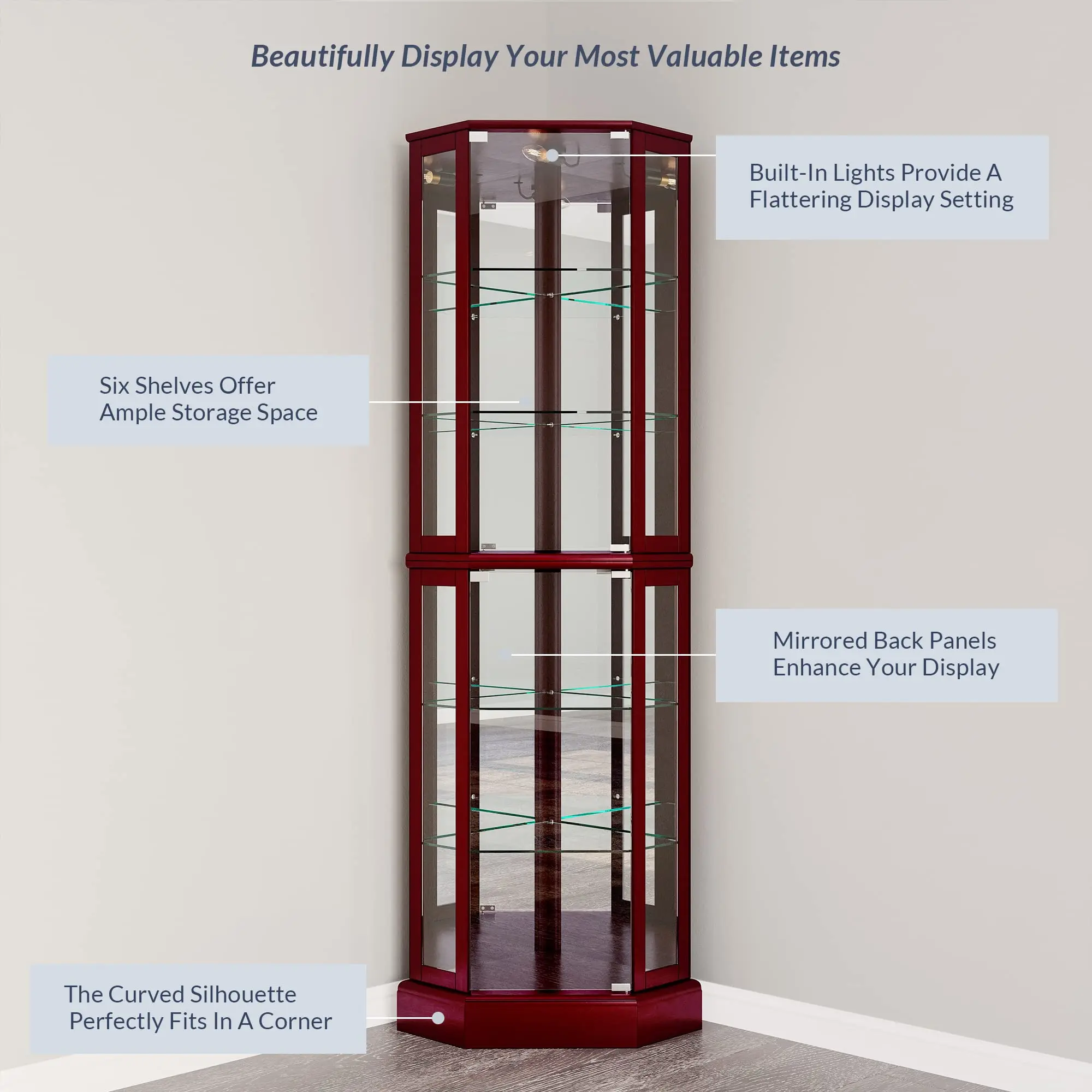 - [Plenty of Gorgeous Display Space] – This storage cabinet has fantastic 2 side-hung glass pane doors and a total of 6 triangular corner shelves divided into two sections. Shelves are adjustable to your liking. An included light lets you add extra flair and beaming light to whatever you choose to display inside. Mirrored back panels help create a grand showcase.
