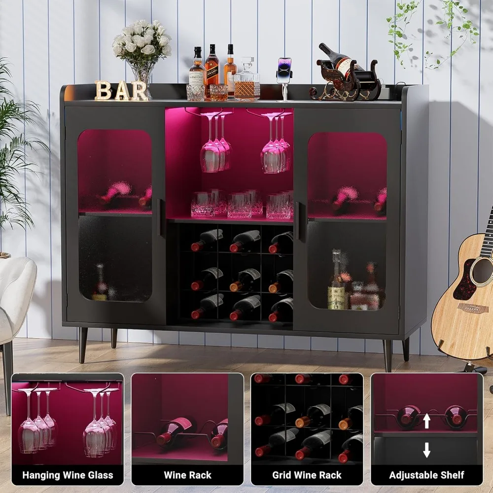 - Large & Flexible Storage: The bar cabinet combines wine racks, glass holders, and storage cabinets. This wine cabinet has open storage spaces and storage cabinet with two glass doors that offer plenty of room for storing bar and kitchen essentials. The cabinet shelves have 3 heights can be adjusted and the wine rack can be removable for your needs.