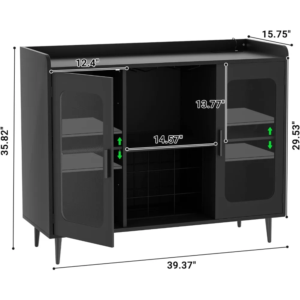 - Coffee bar cabinet with Charging Station: This bar cabinet is equipped with a built-in power strip with 3 Power outlets and 2 USB charging ports, which can easily charge coffee maker, bar accessories, glowing decorations and other devices, without having to search for a separate power source.