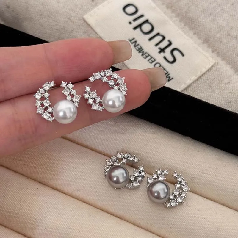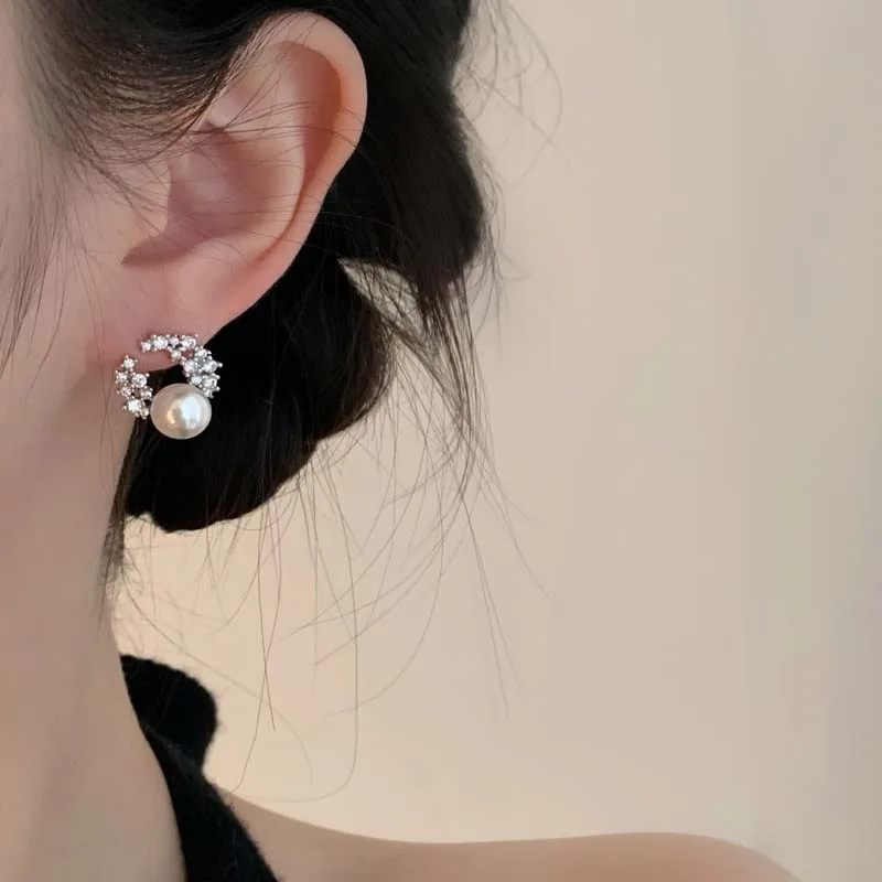 Luxury Crystal Pearl Stud Earrings for Women Girls Exquisite Silver Color Metal Geometric Circle Earrings Wedding Jewelry Gifts
