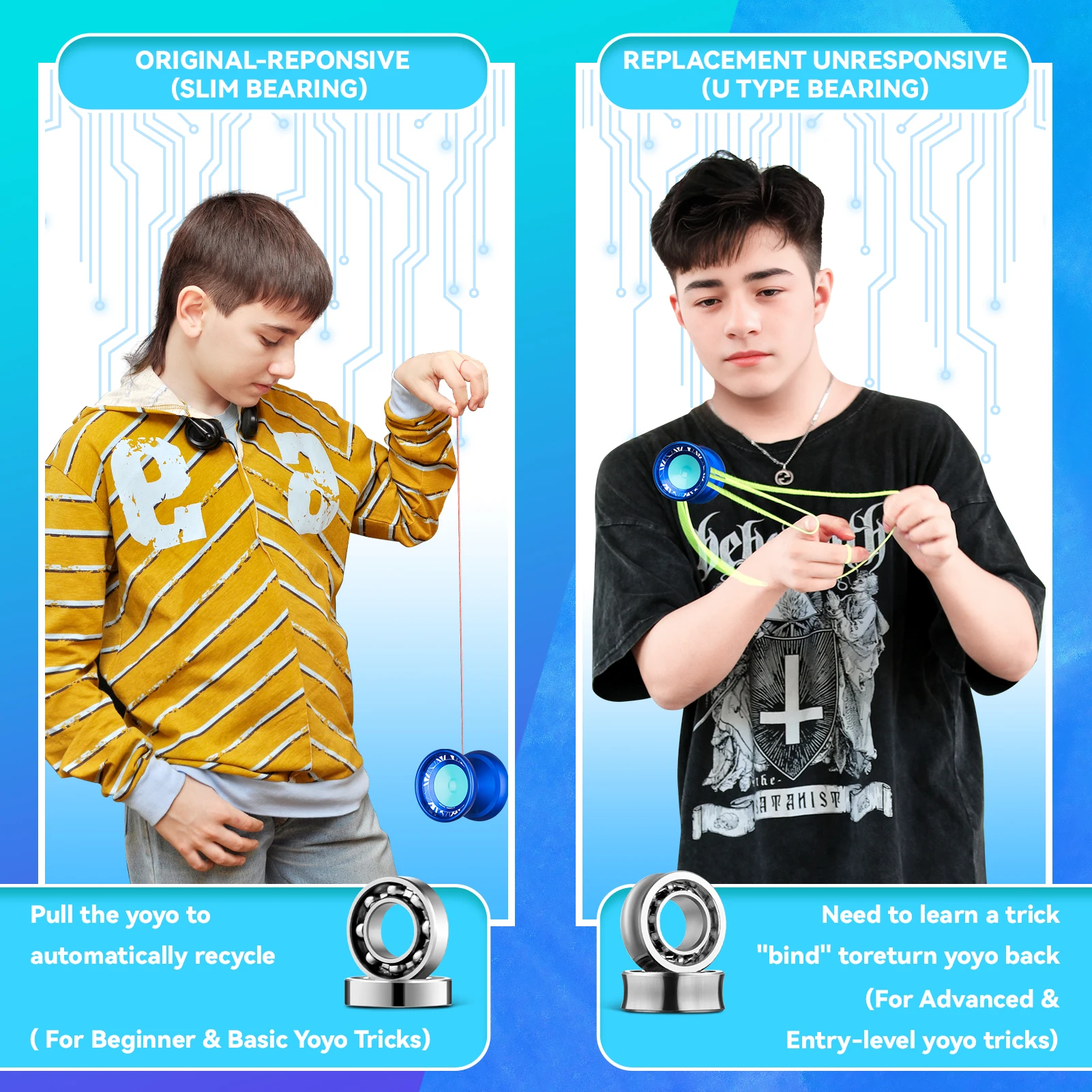 Unresponsive Yoyo Play: For advanced players, the Responsive Yoyo V11 can be easily switched to unresponsive mode by changing the bearing. In this mode, the yoyo requires a bind to return to your hand, allowing for longer spin times and more complex yoyo tricks. This mode challenges players to push their yo-yo skills and creativity, enabling the advanced and freestyle yoyo tricks.