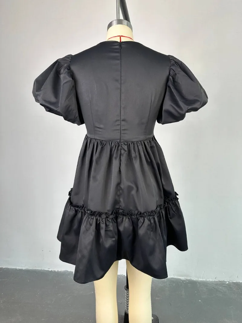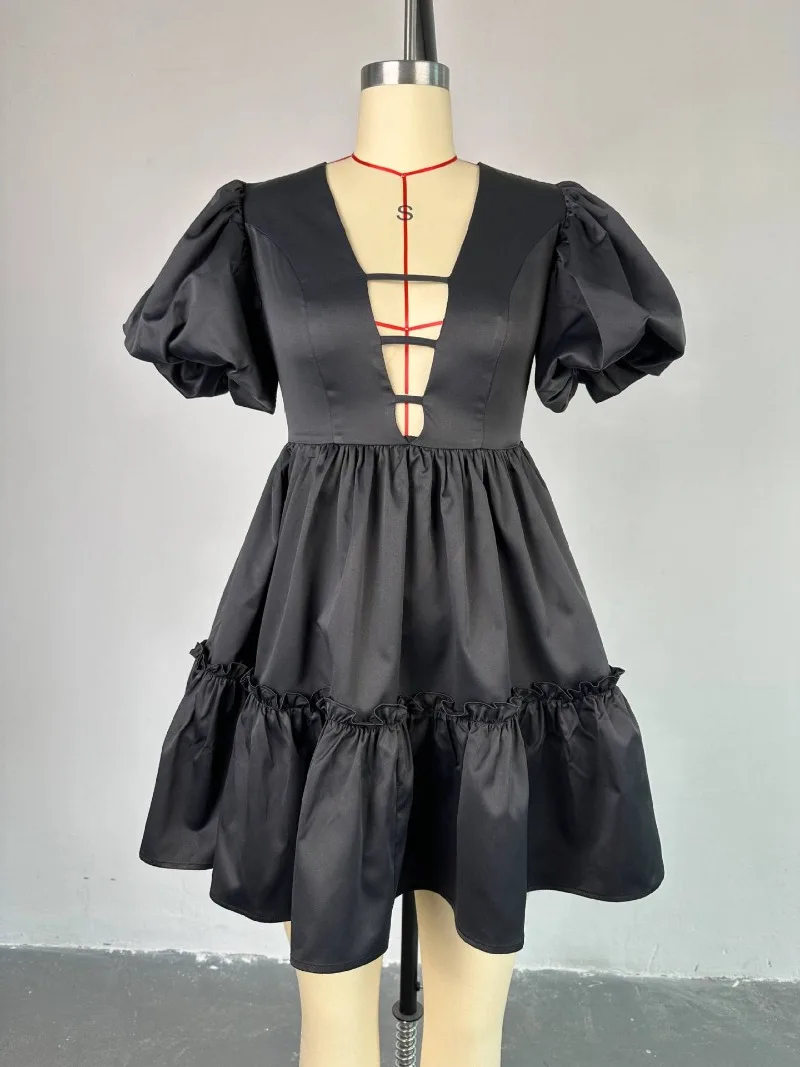 Mandylandy Summer Sweet Sexy Black Dress Women V-neck Puff Sleeve High Waist Stitching A-line Dress Slim Ruffle Bubble Dress