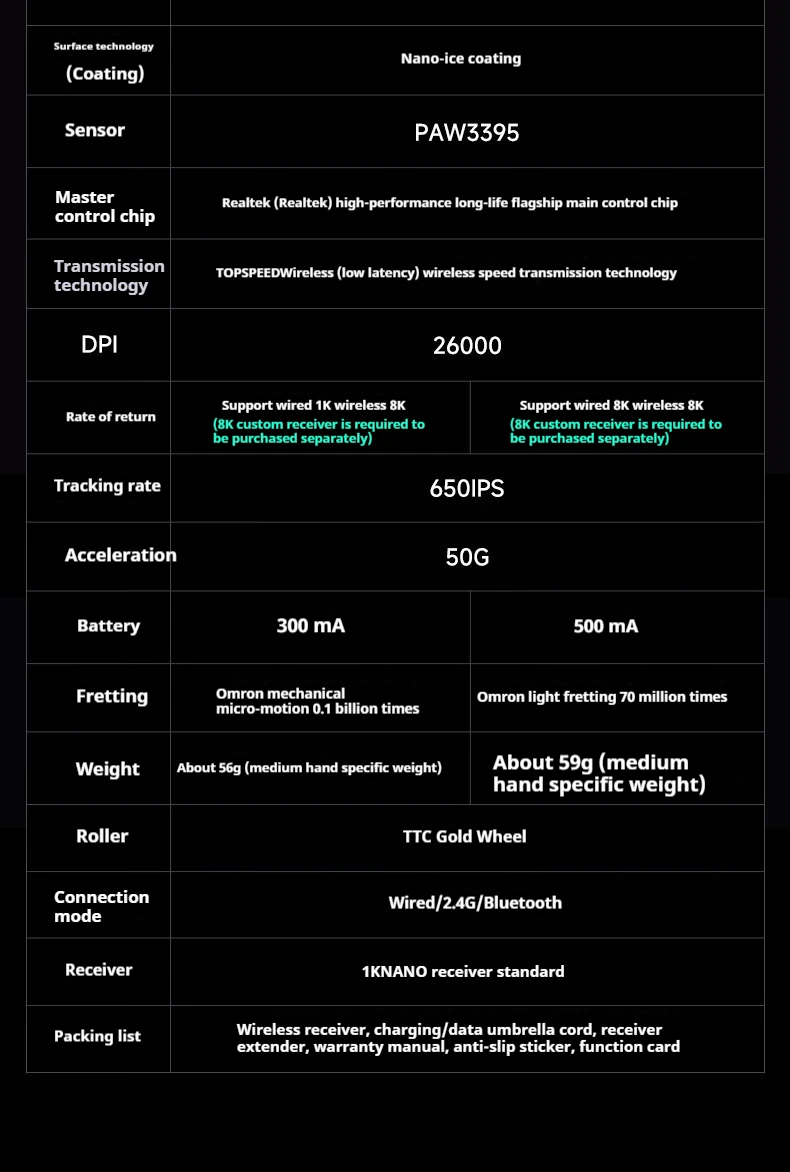 Connection methods: wireless 2.4G, wired, Bluetooth