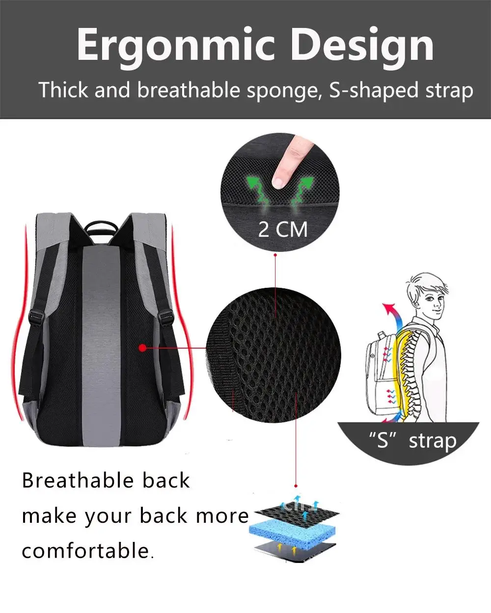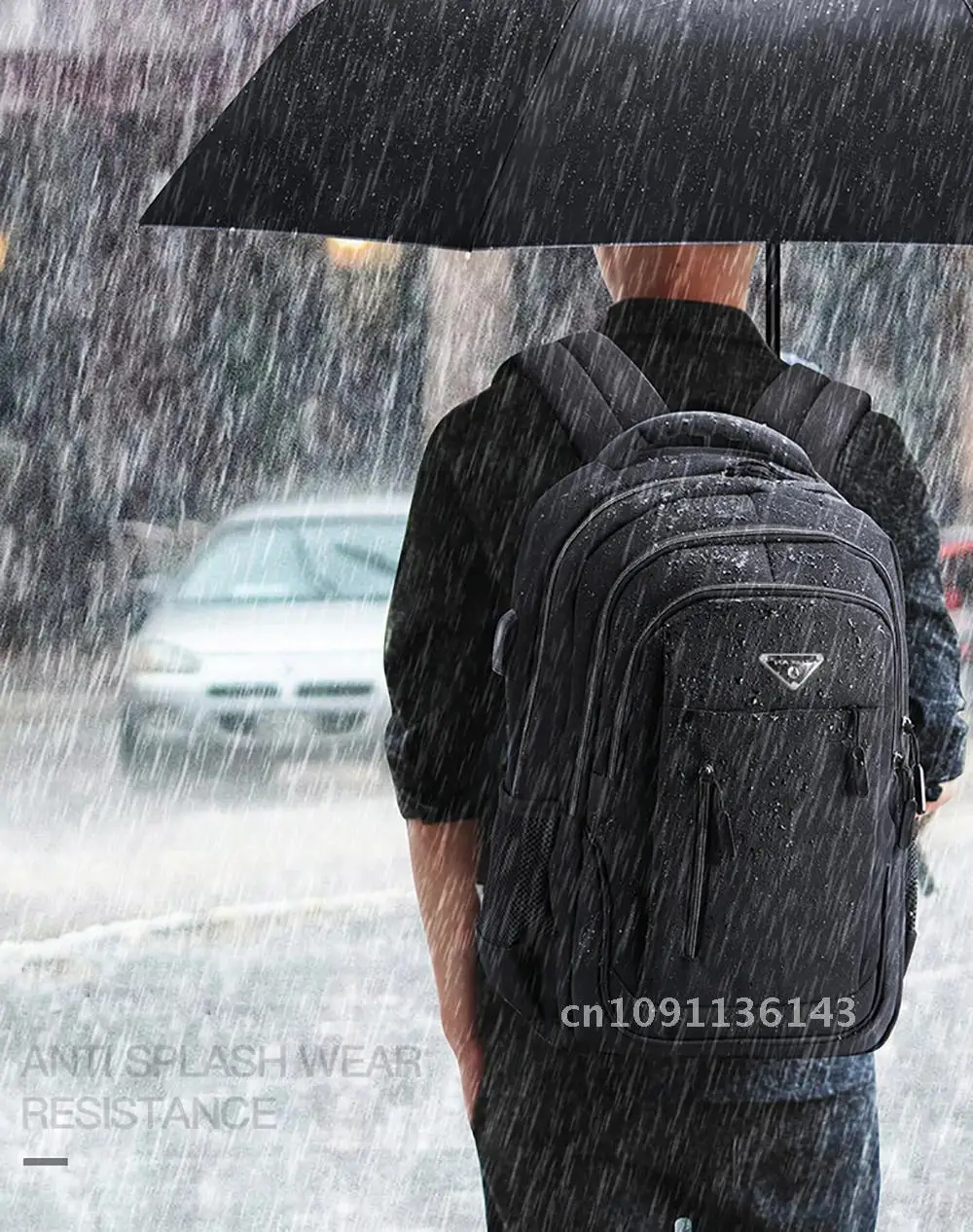 1. Name:Men Backpack2. Material: Oxford3. Lining: Polyester4. Size: 47cm*33cm*17cm.(Due to measurement errors, it is normal for the actual size to be within the range of 1-2cm)5. Highlight: Super load-bearing,USB Charging,Large capacity and multiple partitions6. Applicable occasions: Business,School,Leisure,Sport,Outdoor,Party
