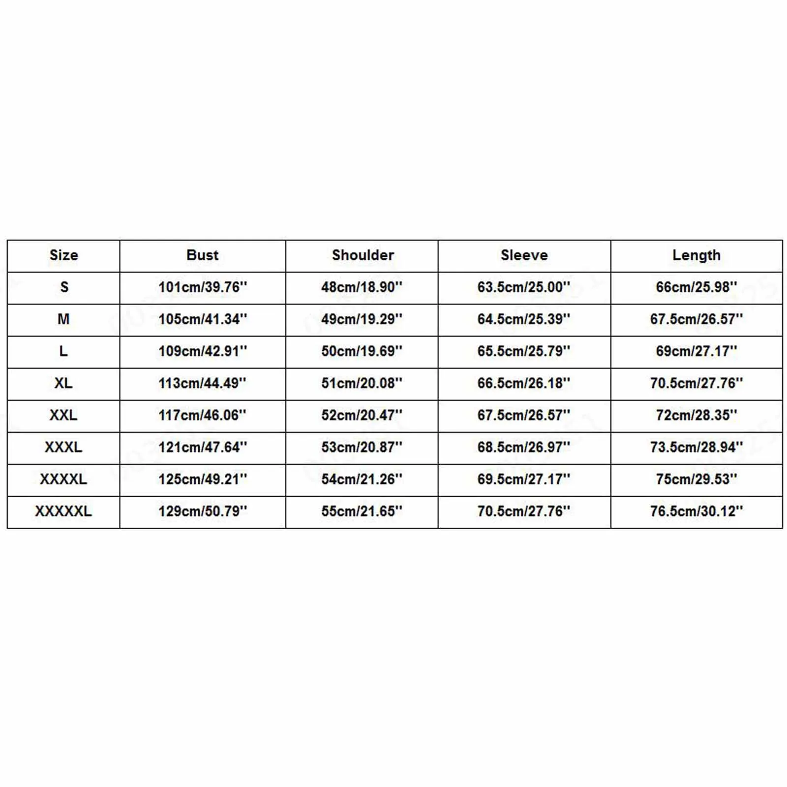| Size:XXXXXL | Bust:129cm/50.79” | Shoulder:55cm/21.65” | Sleeve:70.5cm/27.76” | Length:76.5cm/30.12” |