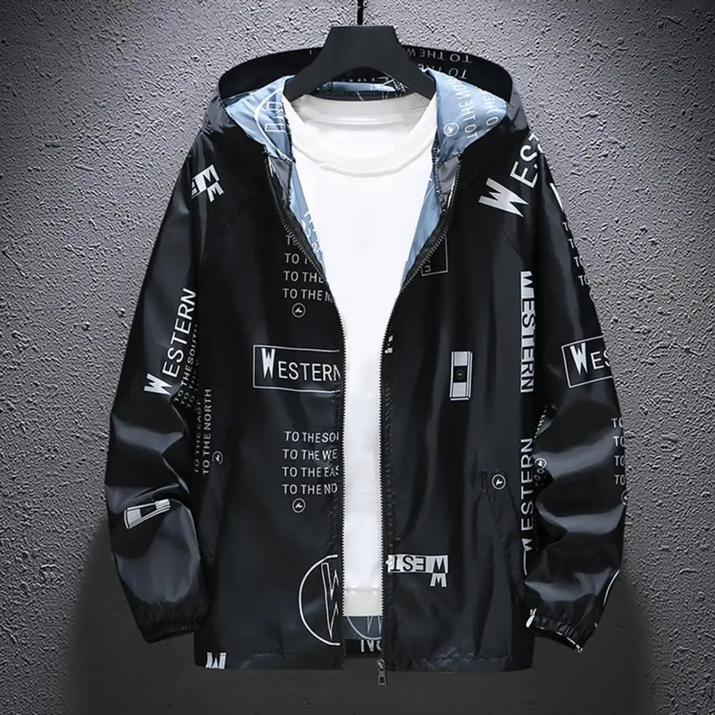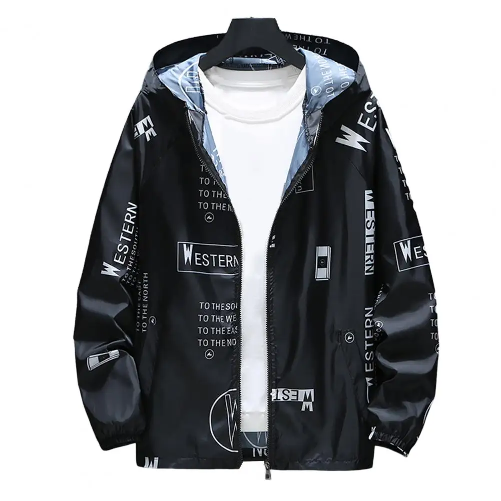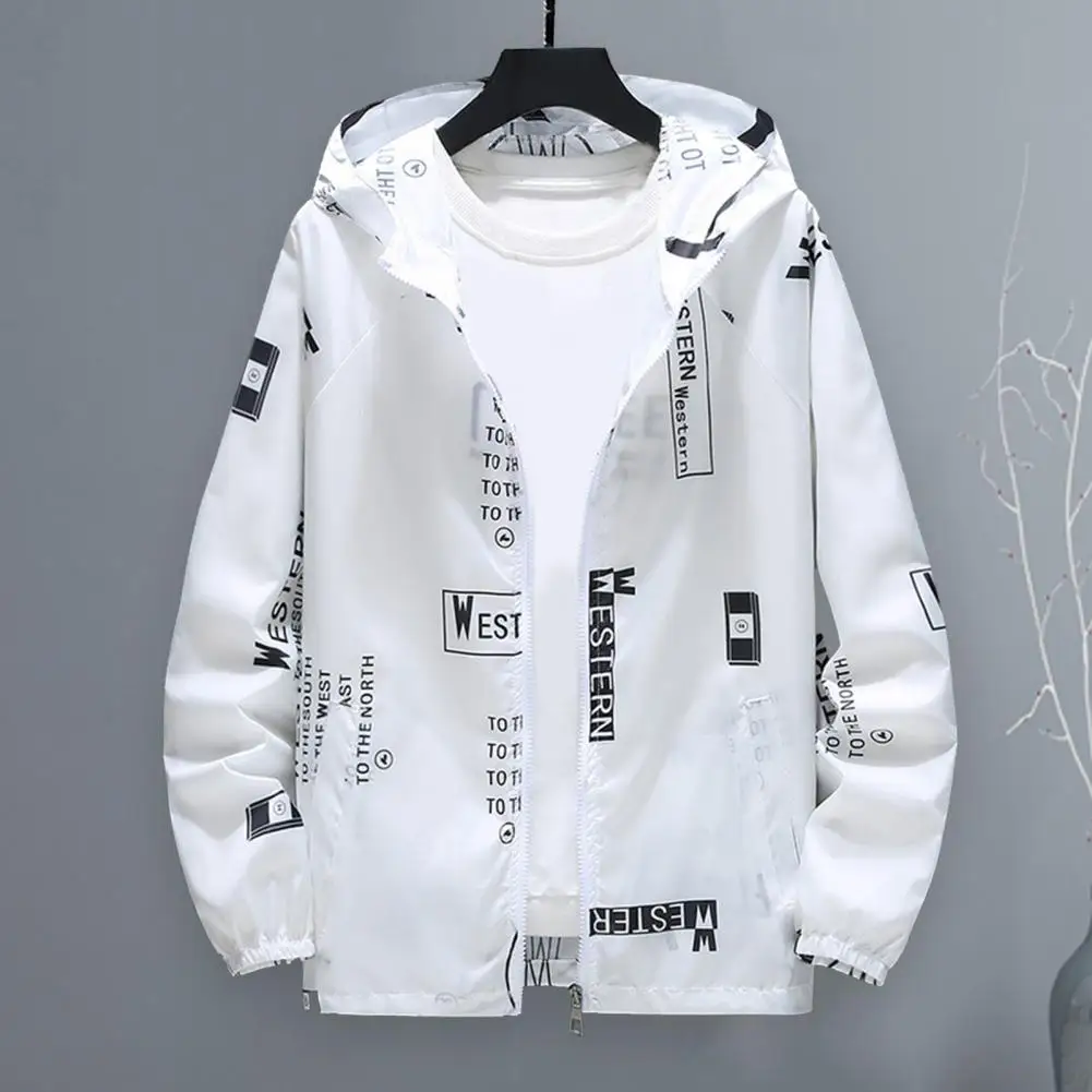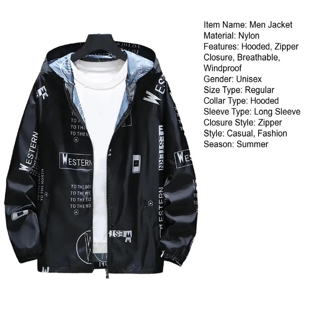 Men Jacket Hooded Zipper Closure Anti-UV Breathable Windproof Daily Wear Elastic Cuff Letter Print Jacket Coat for Daily Life