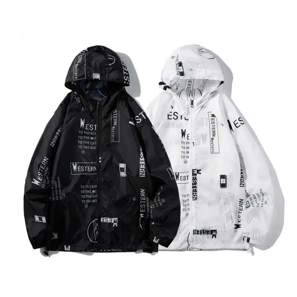 Men Jacket Hooded Zipper Closure Breathable Windproof Anti-UV Elastic Cuff Letter Print Jacket Coat Hooded Windbreaker Coats