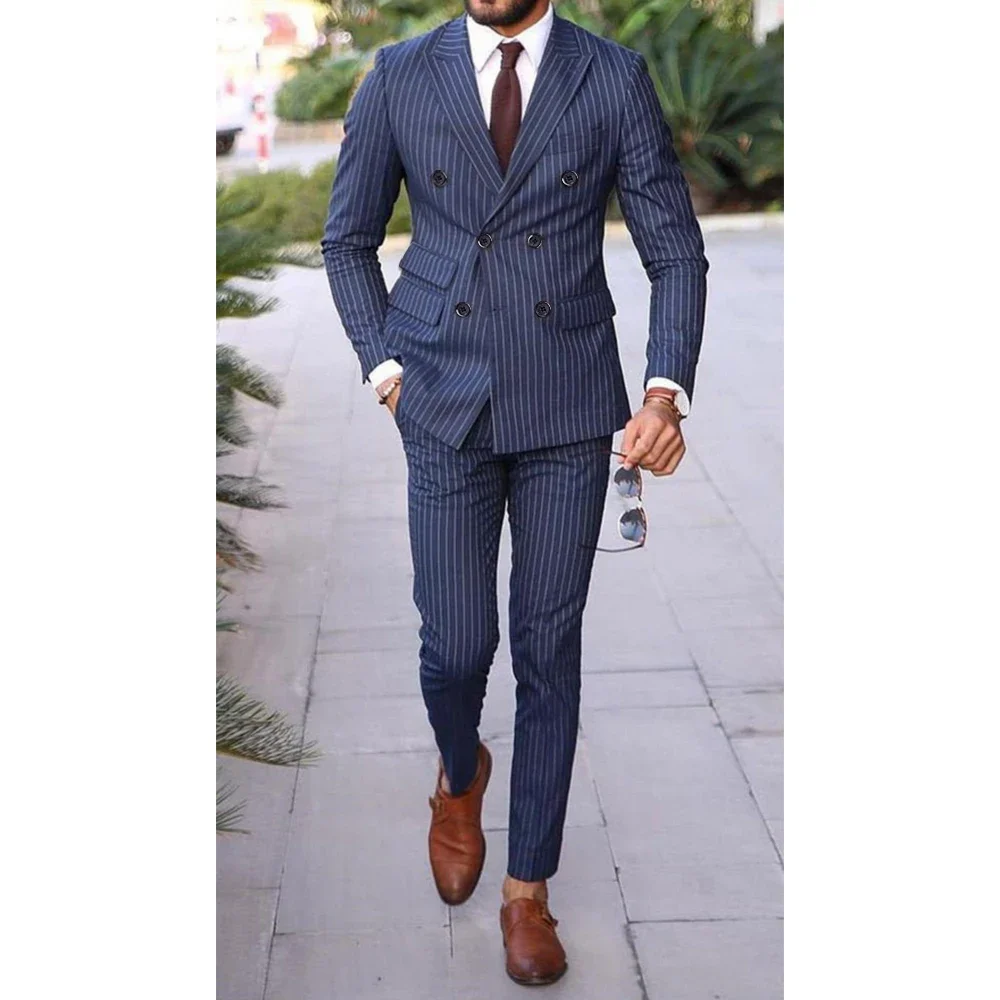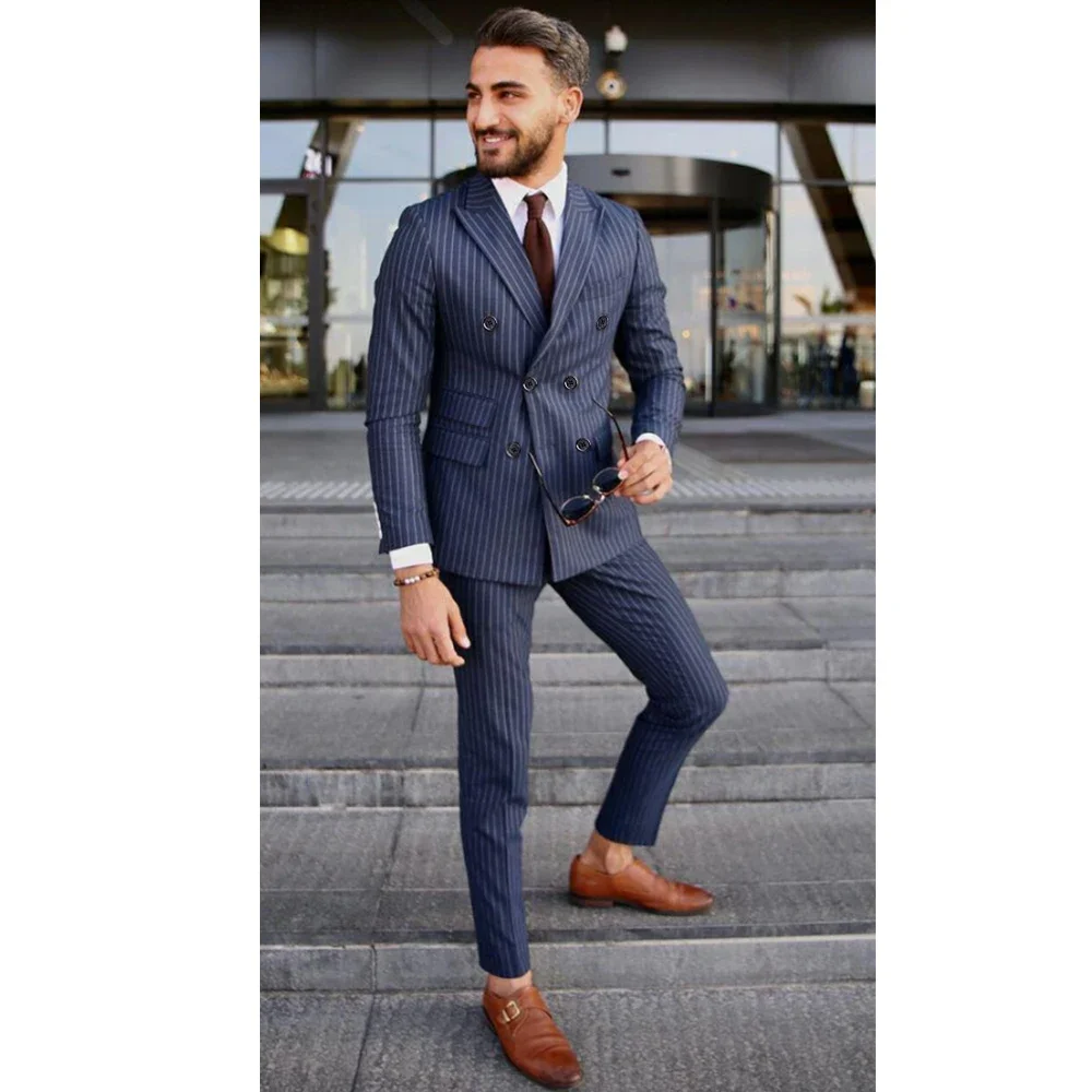 Men Suit Blue Luxury Peak Lapel Double Breasted Costume Homme Slim Fit High Street 2 Pcs Jacket Pants Business Blazer Set